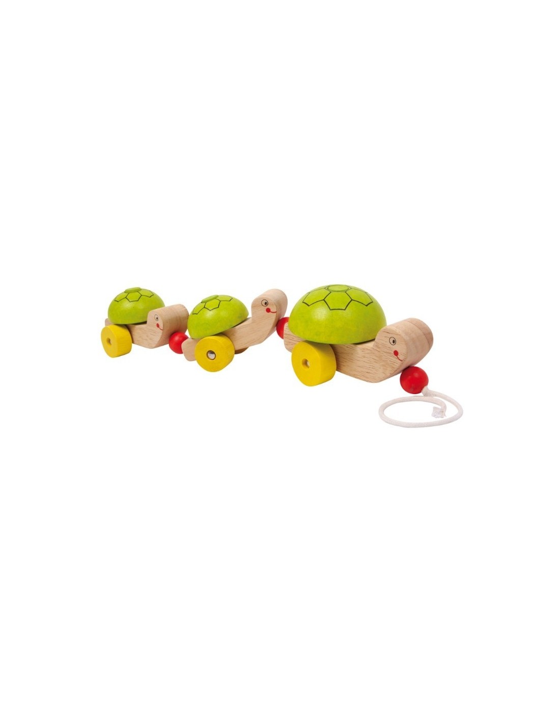 Aquesta simpàtica família de tortugues, unida per una corda d'arrossegament, cobra vida en moure's: les closques giren de manera divertida quan les rodes giren, despertant la curiositat i el somriure dels petits.