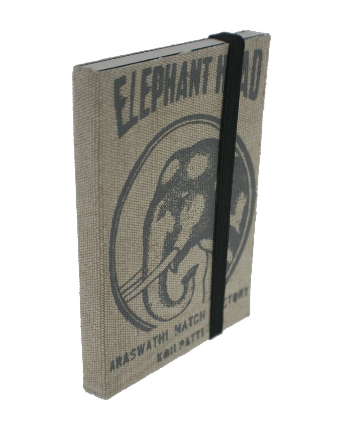 Llibreta petita per a notes, ideal per portar a la butxaca o bossa. Tapa de roba amb il·lustració d'un elefant i goma elàstica lateral per a subjecció. Fulles de color blanc.