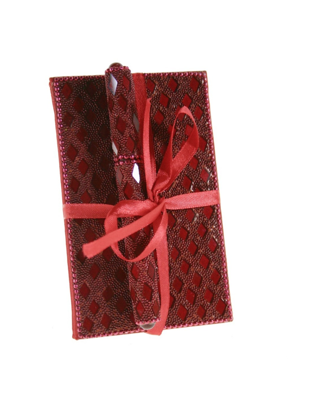 Llibreta petita de butxaca amb tapes rígides adornades amb pedreria en color granat, ideal per portar a la bossa. Inclou un bolígraf a conjunt per anotar les idees en qualsevol moment.