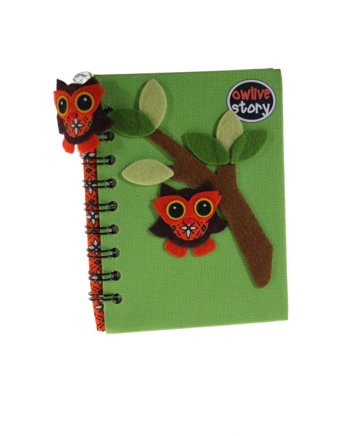 Llibreta petita per a notes amb tapa de roba color verd i dibuix, ideal per a nens. Inclou fulles ratllades i un bolígraf al llom.