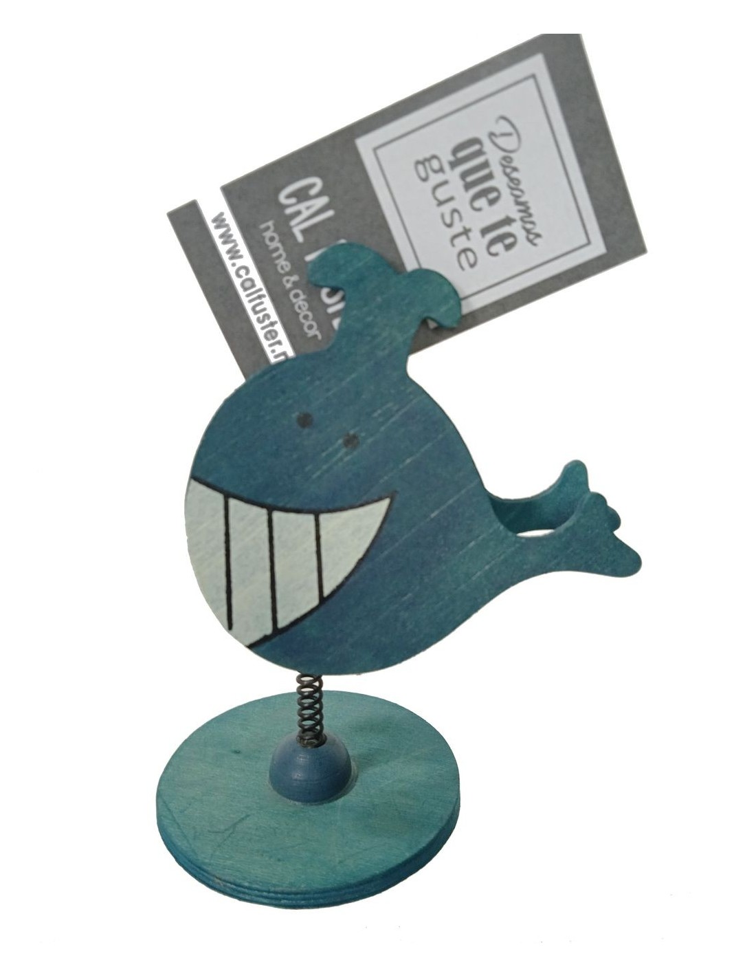 Pinça de fusta forma de balena color blau, base de sobretaula, clip amb suport vertical per a targetes. Mides: 12x9x7cm.