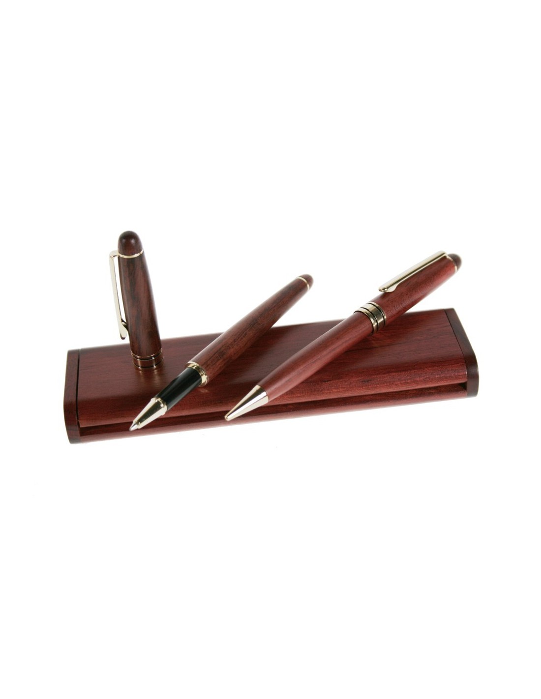 Joc de portamines 1m / m. i roller tinta de fusta color cirerer amb puntera taló de metall i clip daurat, presentat en estoig de fusta.Mesures porta: 14xØ1,3 cm.Mesures estoig: 17x5x2 cm.