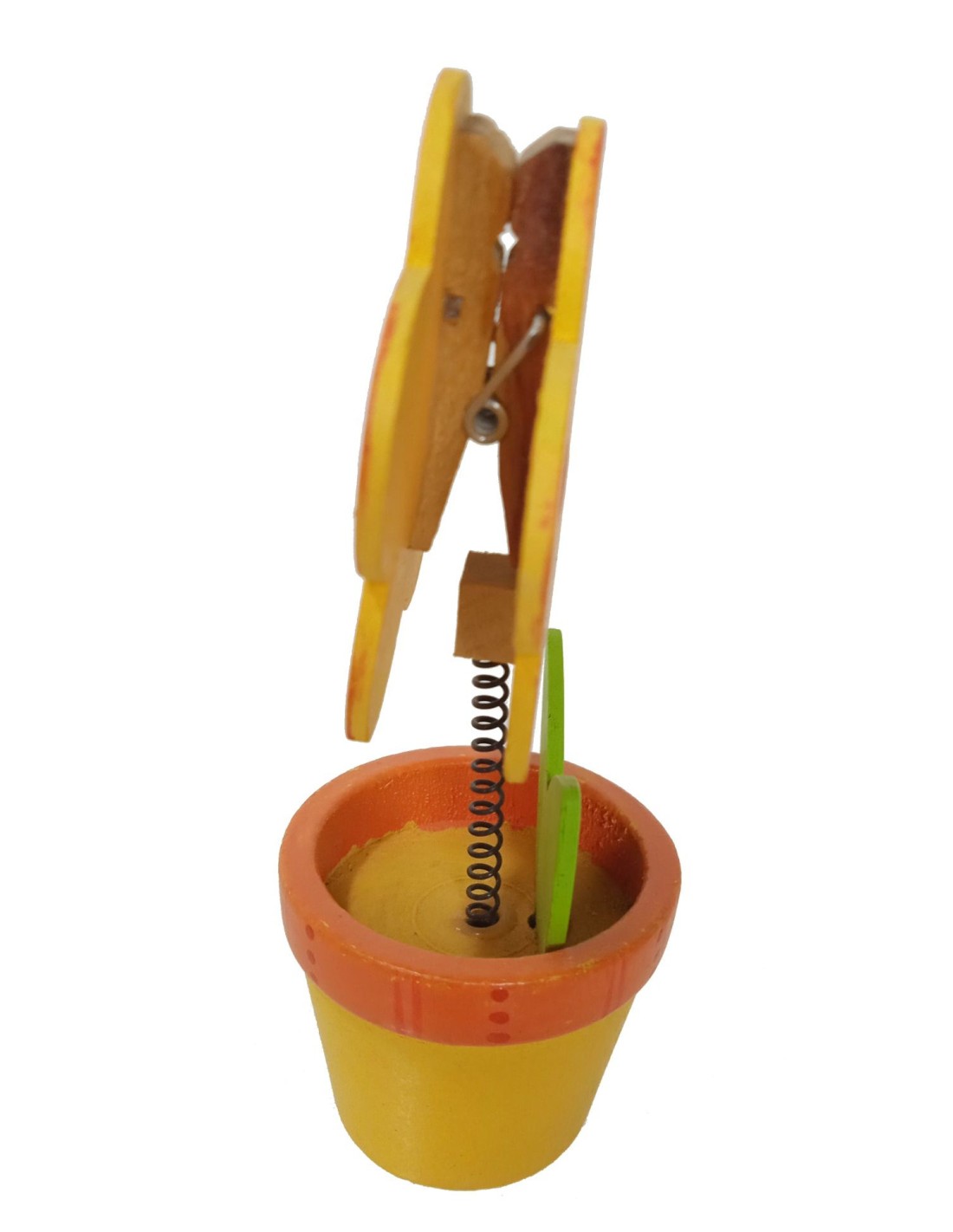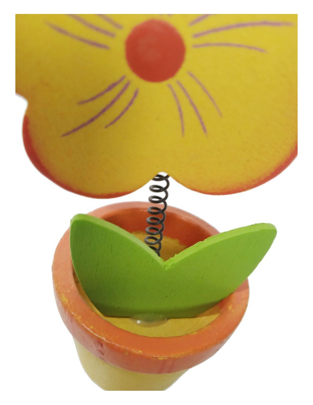 Clip de disseny flor realitzat amb fusta de color groc. Porta clip o subjecta, papers amb suport vertical ideal per exhibir targeta o foto. Un regal diferent per als més petits de la casa o fins i tot un divertit detall per als amics.