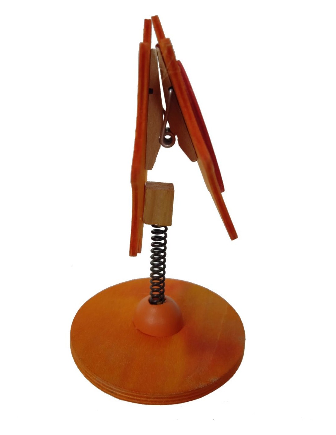 Pinça de fusta forma de sol color taronja, base de sobretaula, clip amb suport vertical per a targetes. Mides: 12x7x7 cm.