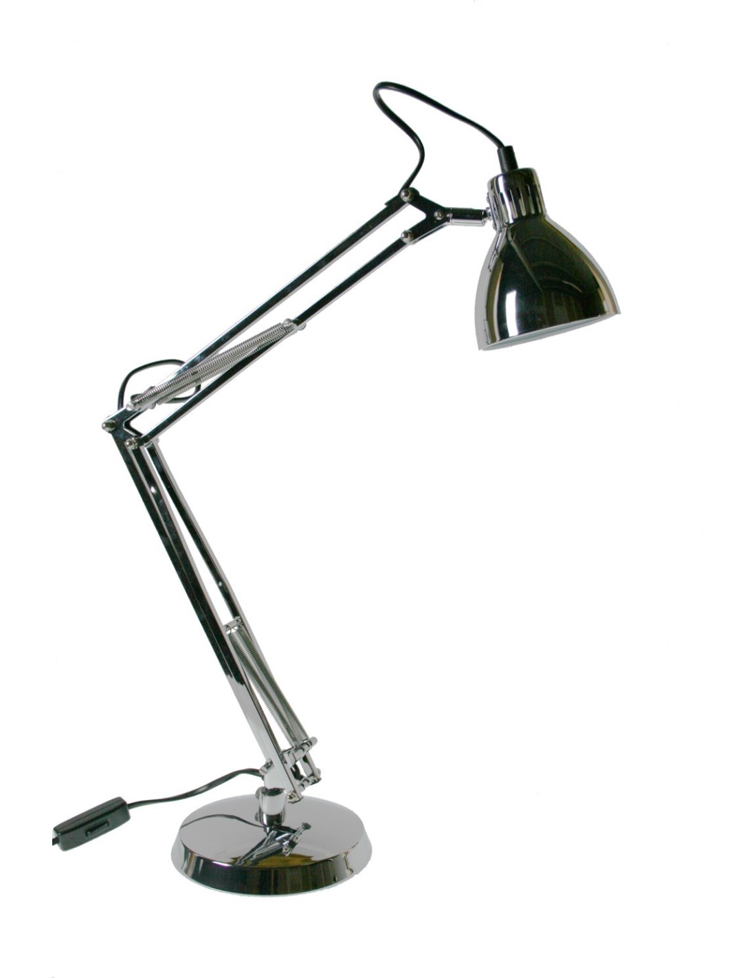 Llum de sobretaula amb estructura metàl·lica cromada i disseny tipus flexo. Un model elegant i pràctic amb aire retro, ideal per estudiar, llegir o treballar amb estil.