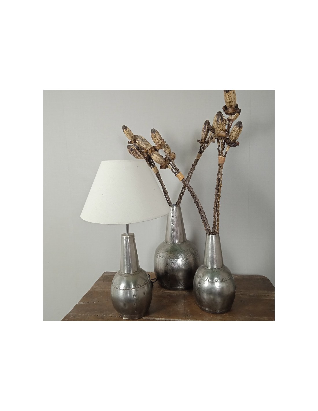 Original llum de sobretaula fabricada en metall color estany que us donarà un toc d'exclusivitat i distinció a l'estada escollida, creant un ambient càlid i acollidor.