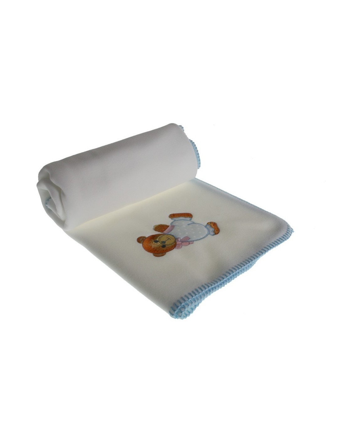 Aquesta manta per a nadons de color blanc, amb un adorable detall d'os blau, és perfecta per al nadó. Suavitat i càlida pels passejos del teu petit.