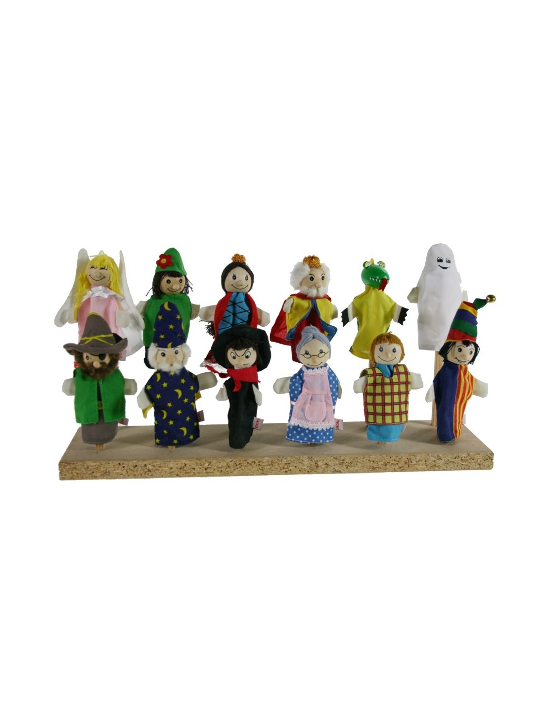 Conjunt de 12 titelles de dit, aprox.13 cm d'alt amb caps de fusta i vestits diferents per varietat de figures en una mateixa representació. Aquestes titelles les pots fer actuar amb el teu teatre de fusta amb els cinc decorats diferents.