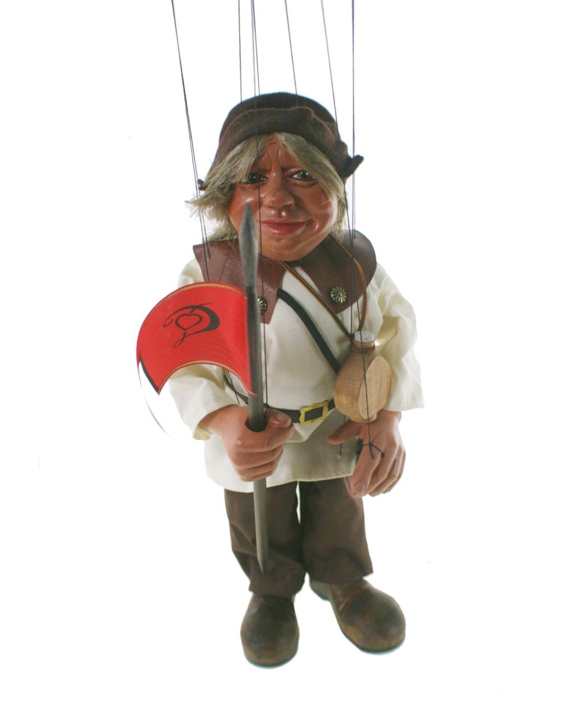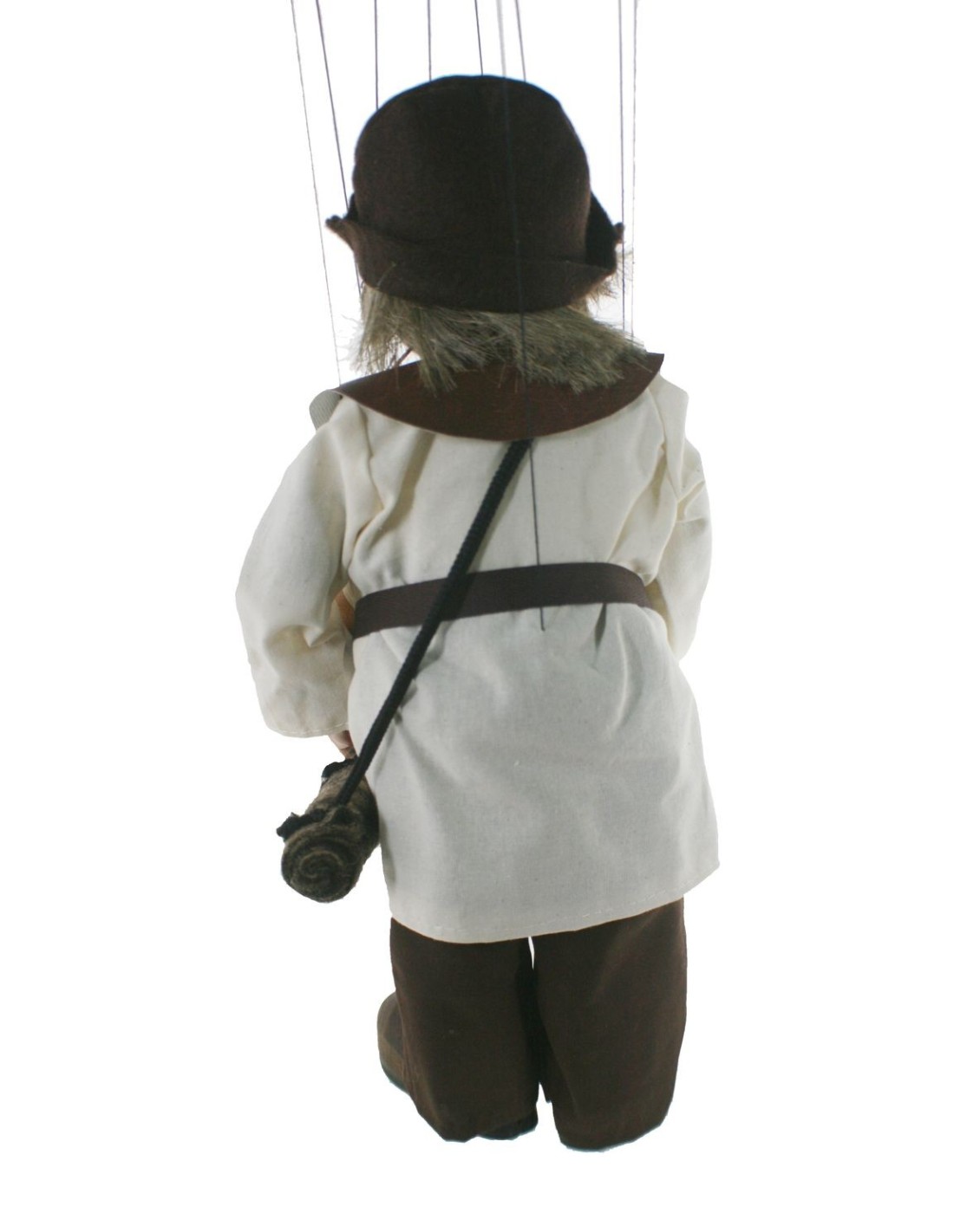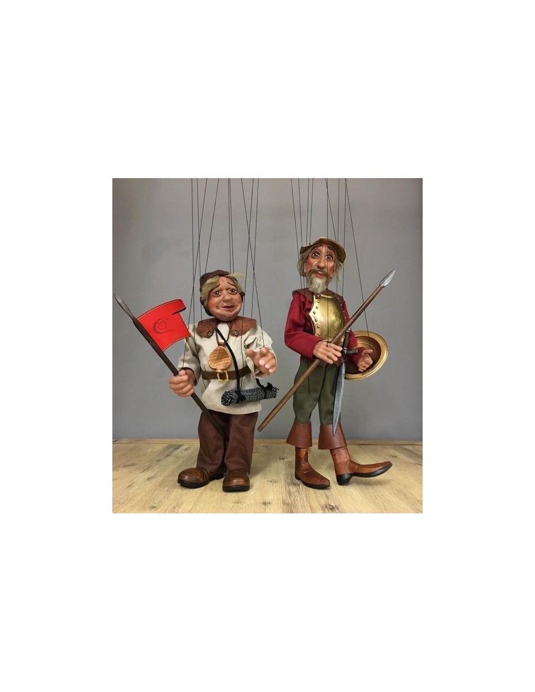La marioneta Sancho Panza, un vilatà rondinaire i ximple que ha acompanyat heroicament el seu mestre en la lluita contra els molins de vent, forma part intrínsecament de la novel·la de Miguel Cervantes. Aquesta titella de pell fosca està pintada a mà, vestida amb vestit elegant típic de l'Espanya medieval. L'escuder porta la bandera del seu amo i el pot d'aigua de fusta també. Aquest titella és un regal ideal per als seus fills o estimats. Una marioneta per als amants col·leccionistes.