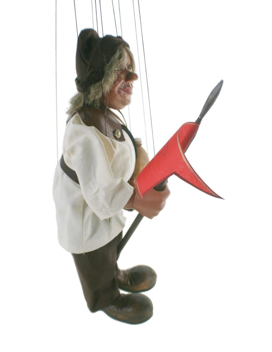 Titella artesanal de corda Sancho Panza construïda en material rígid (resina) amb plançó metàl·lic, cama i calçat en fusta tallada i pintada a mà. És un joc clàssic que permet crear tot un món de fantasia i diversió i alhora desenvolupar la intel·ligència i imaginació del nen.