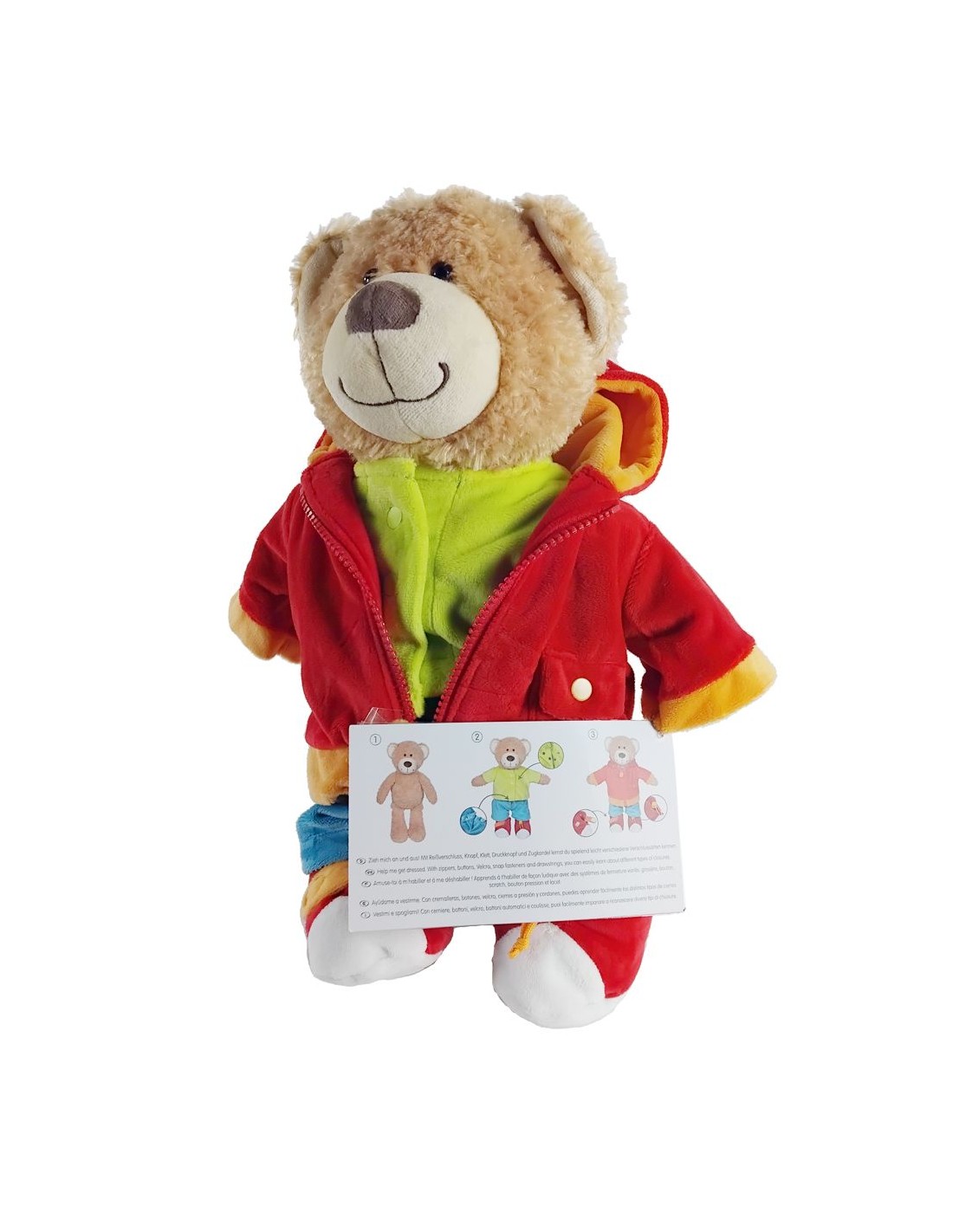 Amb aquest osset, els petits poden millorar la seva coordinació ull-mà, la seva destresa i la seva paciència, alhora que aprenen a vestir-se de manera autònoma. La roba és fàcil de manipular i està dissenyada per adaptar-se a les mans petites.
