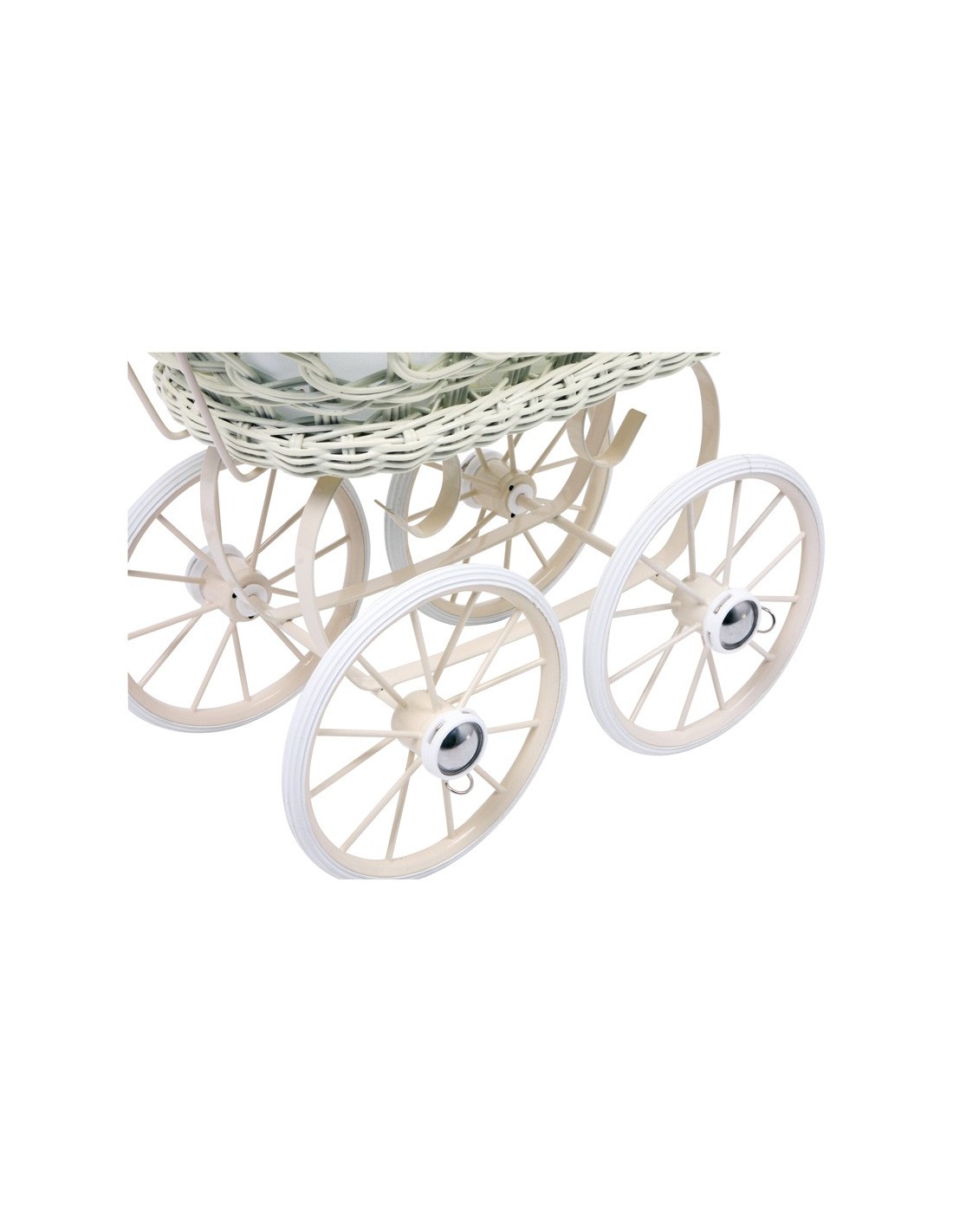 Aquest cotxet, com en els vells temps, és un veritable vehicle per als canells. Un cotxet petit de nines de vímet color blanc d'estil romàntic que també pots gaudir com a decoració a qualsevol estança de la llar.