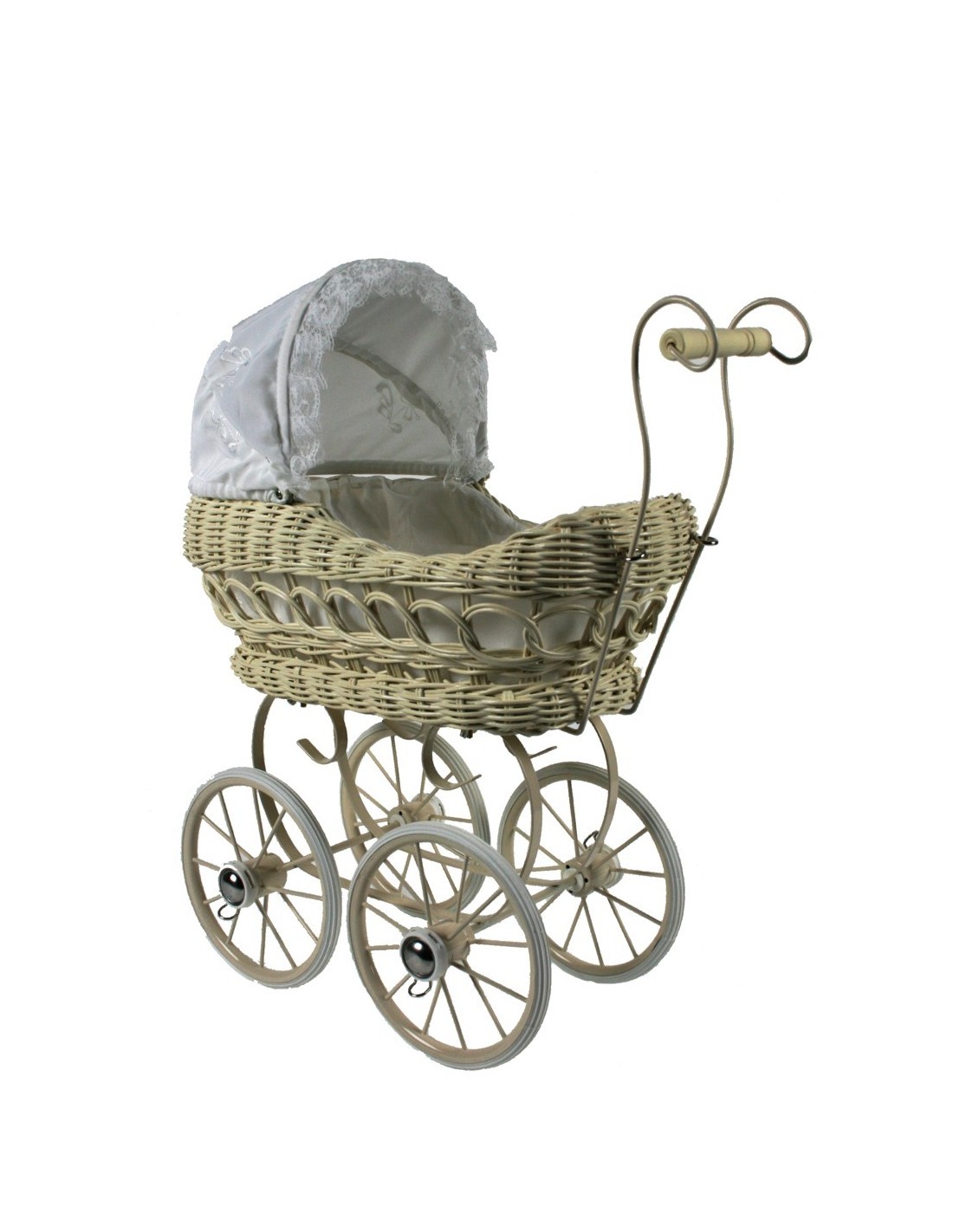 Joguina elegant i amb una bella decoració. El cotxet té bastidor de metall i cistella de vímet. Les rodes amb cèrcols de goma permeten un desplaçament silenciós. Capota plegable amb puntes i brodada finament. També t'adornarà l'habitació i podràs tenir el teu canell preferit en aquest cotxet de vímet folrat en tela. L'adherència és fix de ferro i fusta, les rodes de goma i el xassís de ferro. Un article molt ben acabat. (Article de col·lecció)
