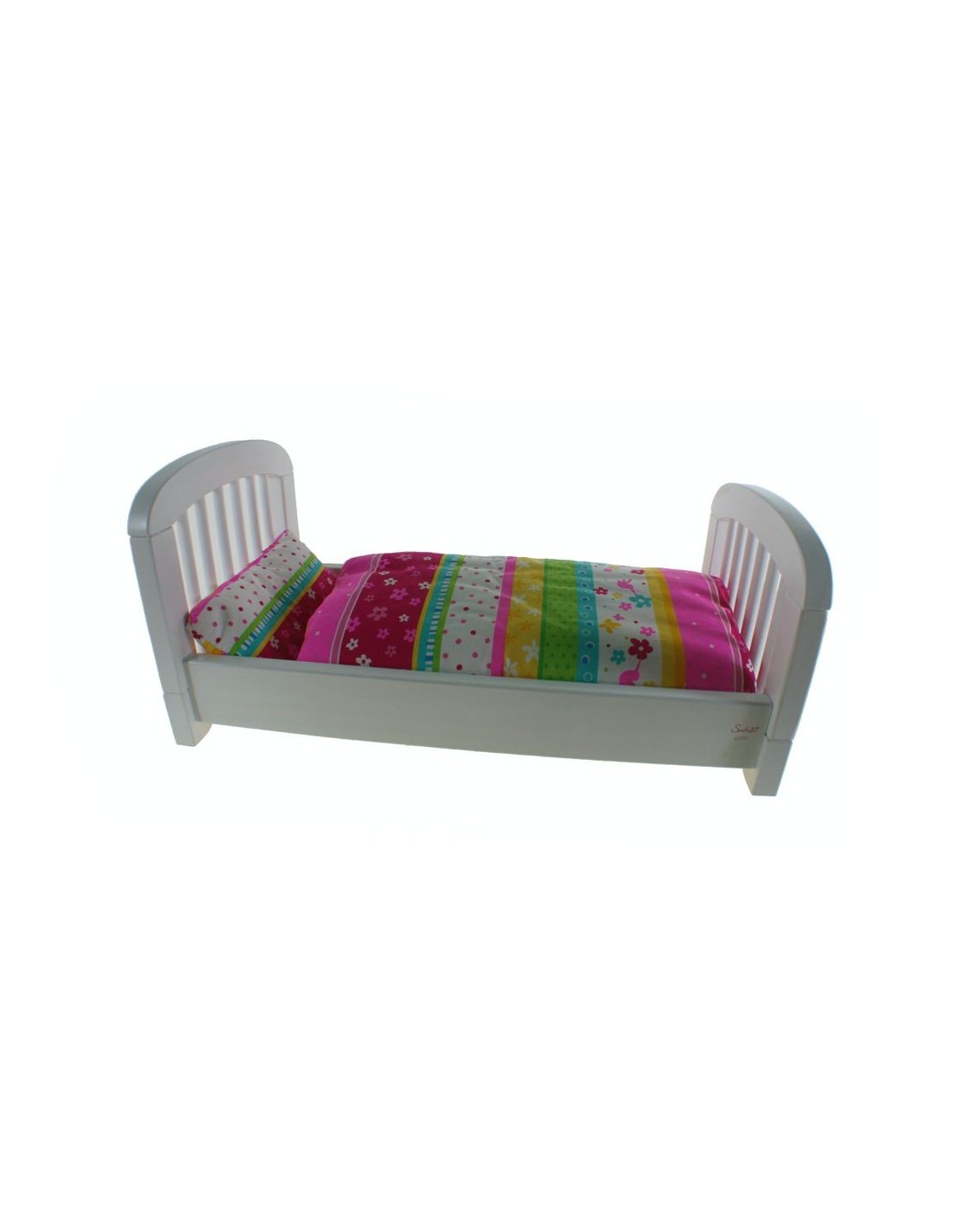 Llit de nines de fusta lacada color blanc amb edredó rosa estampat.