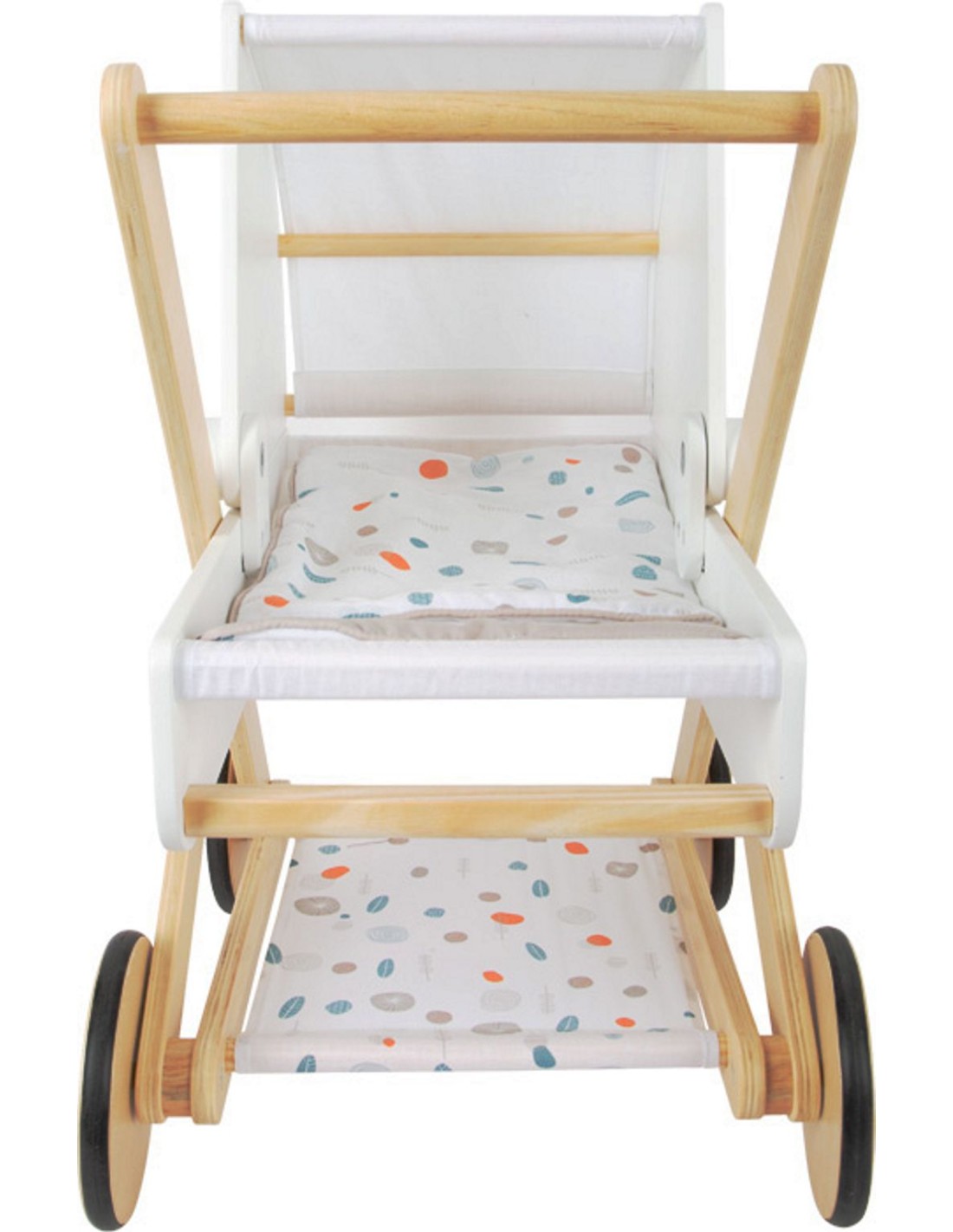 Cotxet de nines modern amb elements de fusta i teixits rentables. Disseny escandinau i neutral, estable i lleuger. Rodes de goma suaus i llit reversible per a ninots de fins a 46 cm. Ideal per als petits cuidadors de nines!