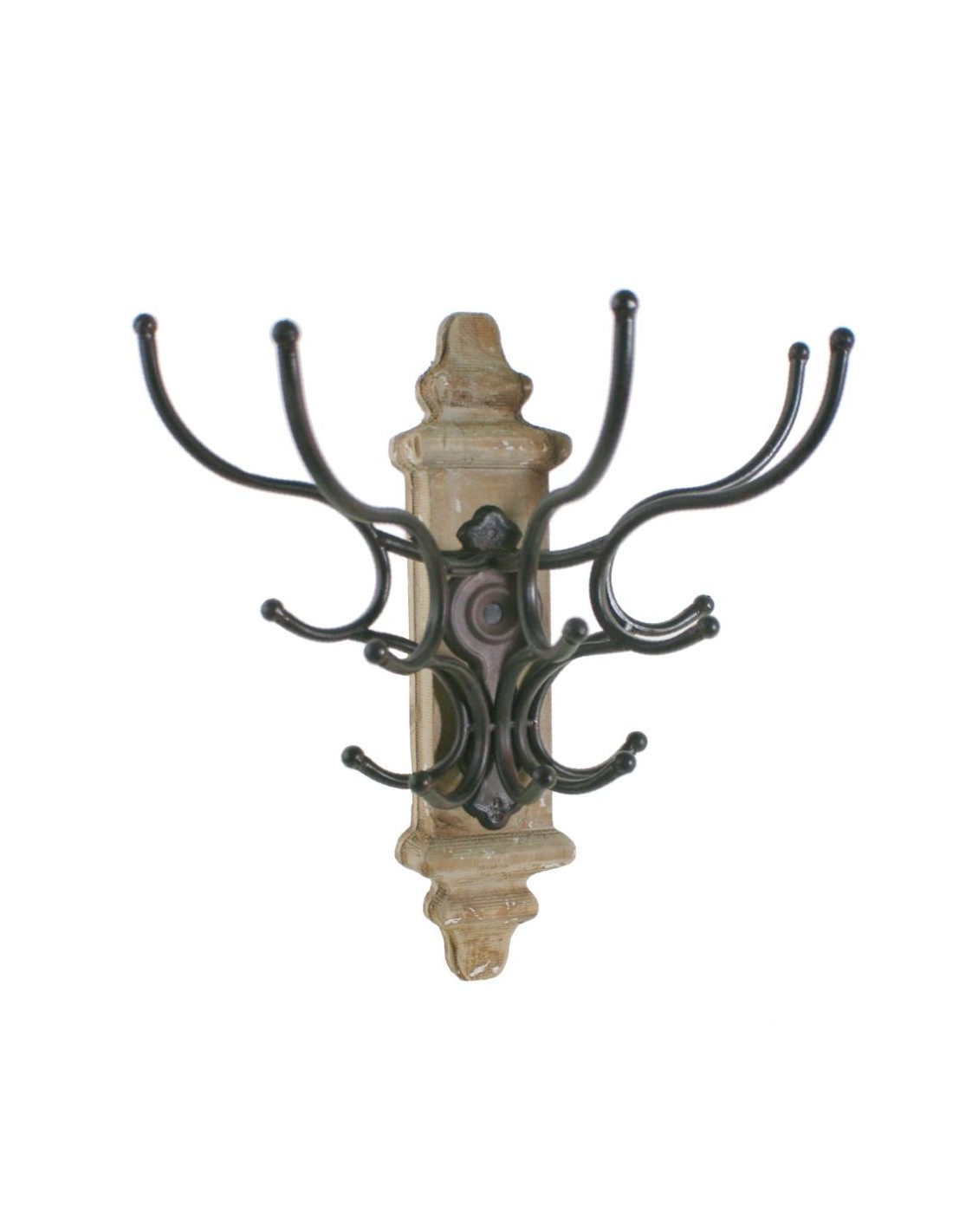 Rústic penjador de paret de 15 ganxos tipus aranya i muntat sobre columna de fusta envellida amb retocs patinats en blanc. Altament decoratiu rústic i molt original. Mesures: 34x34x20 cm.