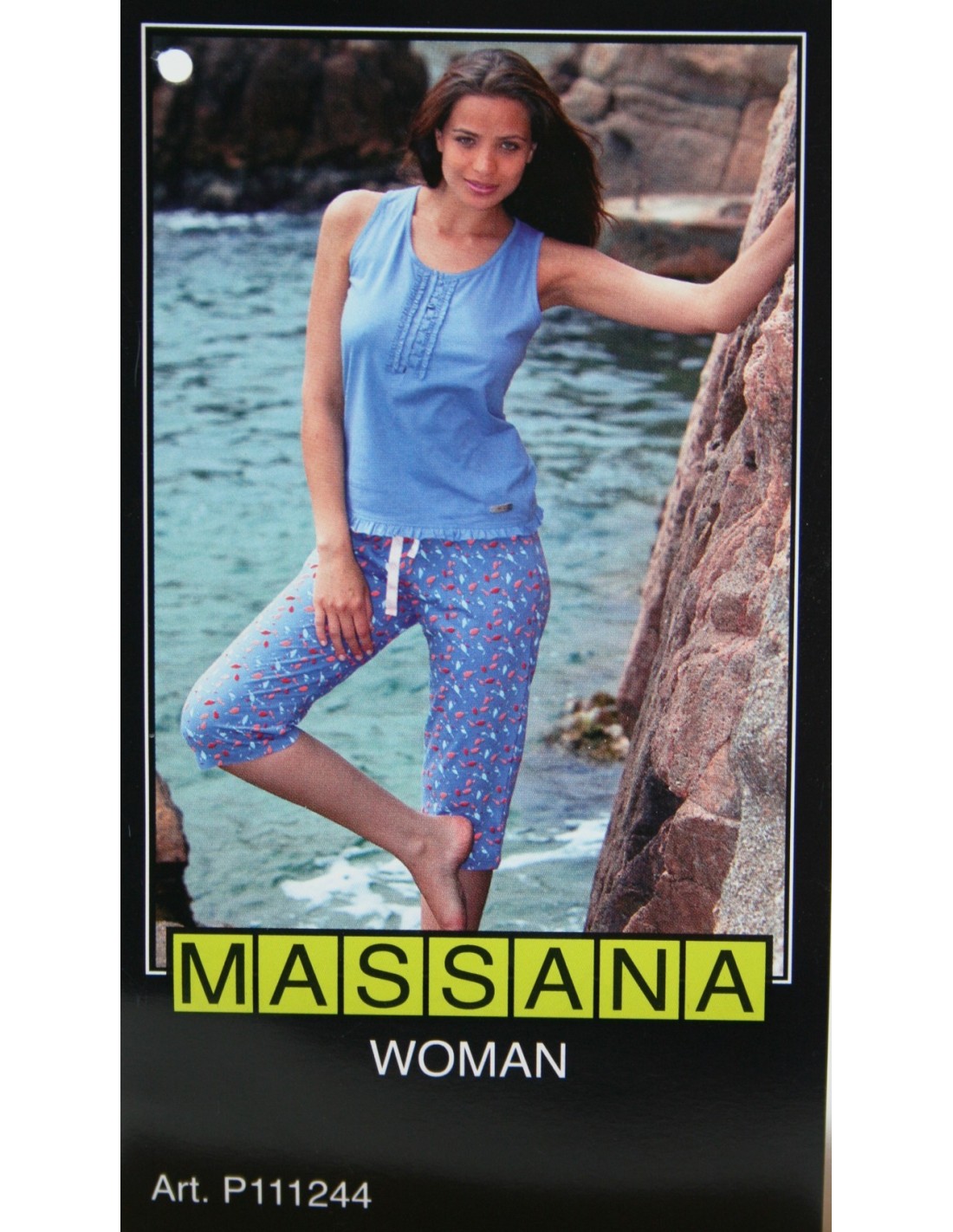 Pijama de color blau grisenc tres peces estampat d'estiu per a senyora de pantalons curts, pantalons 3/4. coll rodó. És important comptar amb els pijames Massana que són molt còmodes a l'hora de dormir, ja que amb ells només hauràs de descansar.