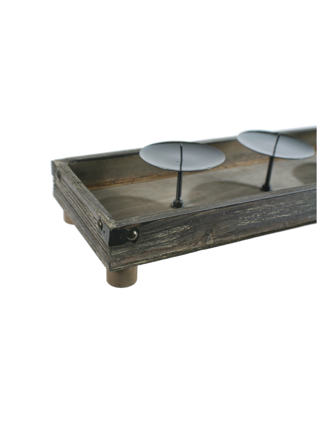 Una meravellosa caixa de fusta de molta presència, amb aplicacions de metall a les cantonades, que conté 4 canelers de metall. (Ø màxim espelmes, 6 cm.) Ideal per a aquestes festes donar un toc de calidesa amb la il·luminació de les espelmes. Omple de Màgia la teva llar amb adorns.