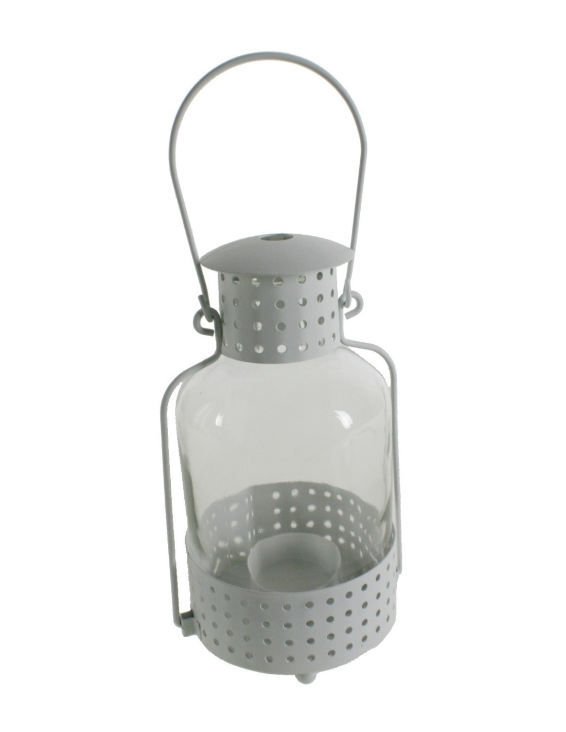 Fanalet blanc de metall i vidre per a espelmes light te fanal amb nansa de subjecció decoració vintage. Mides: 24xØ9 cm.
