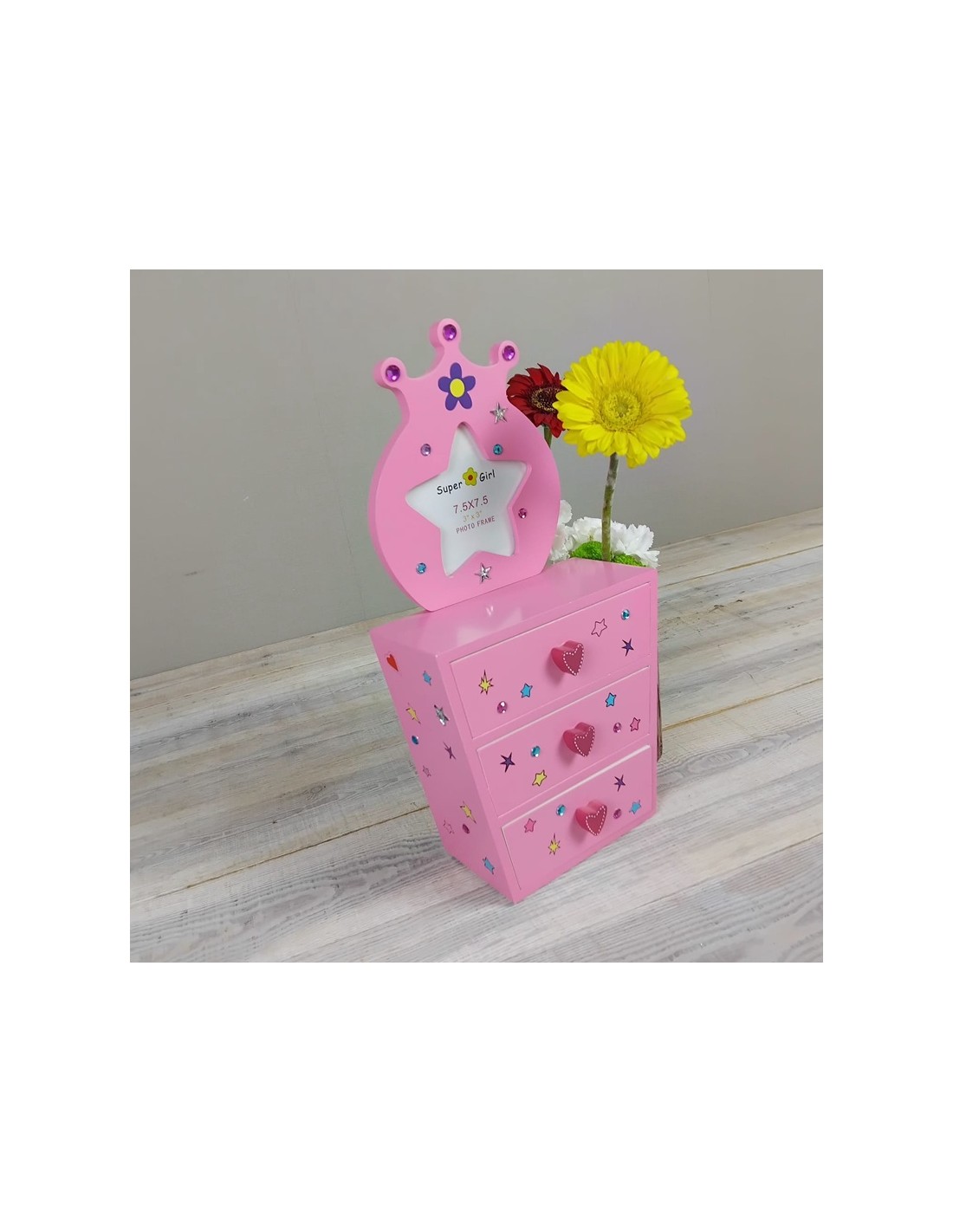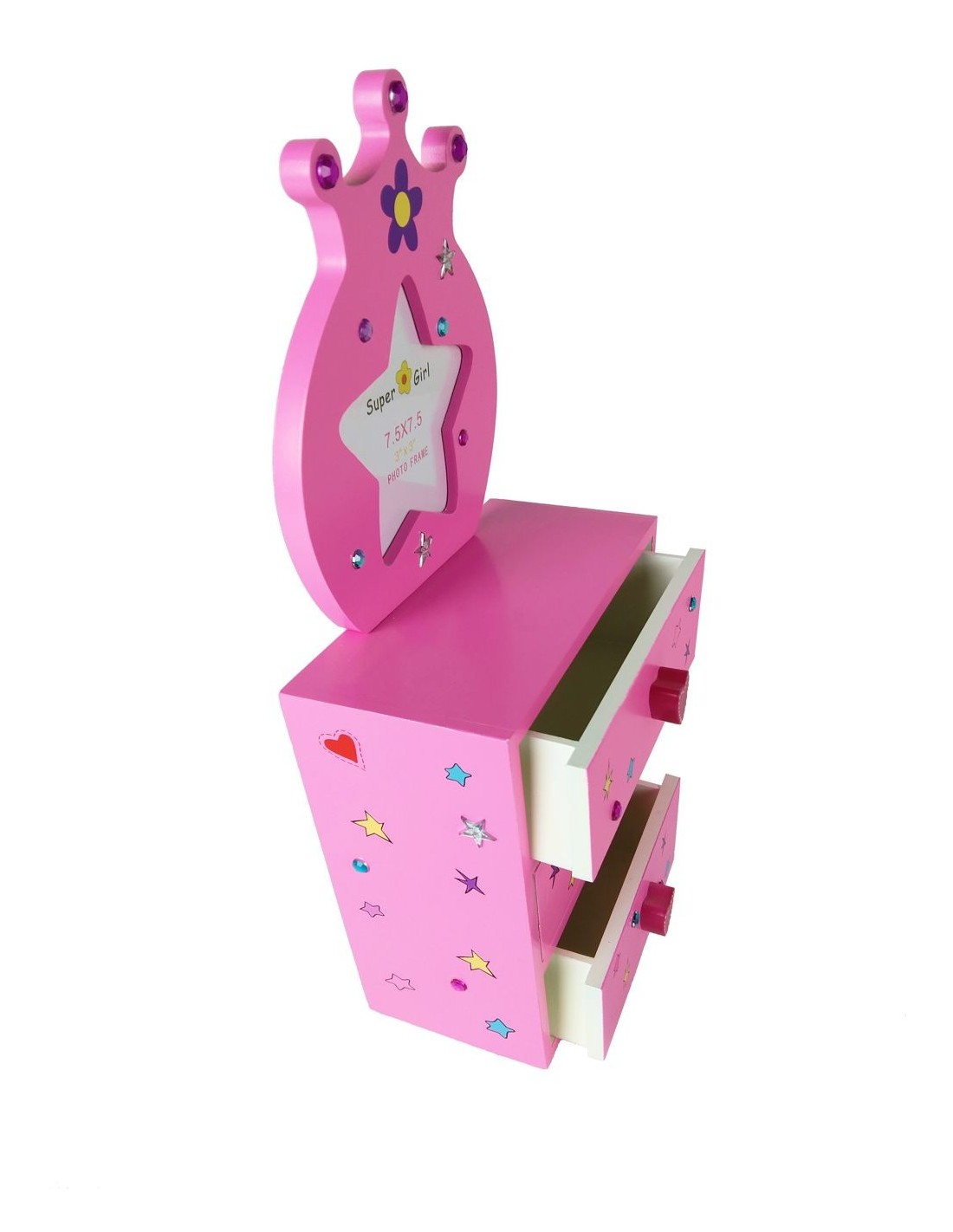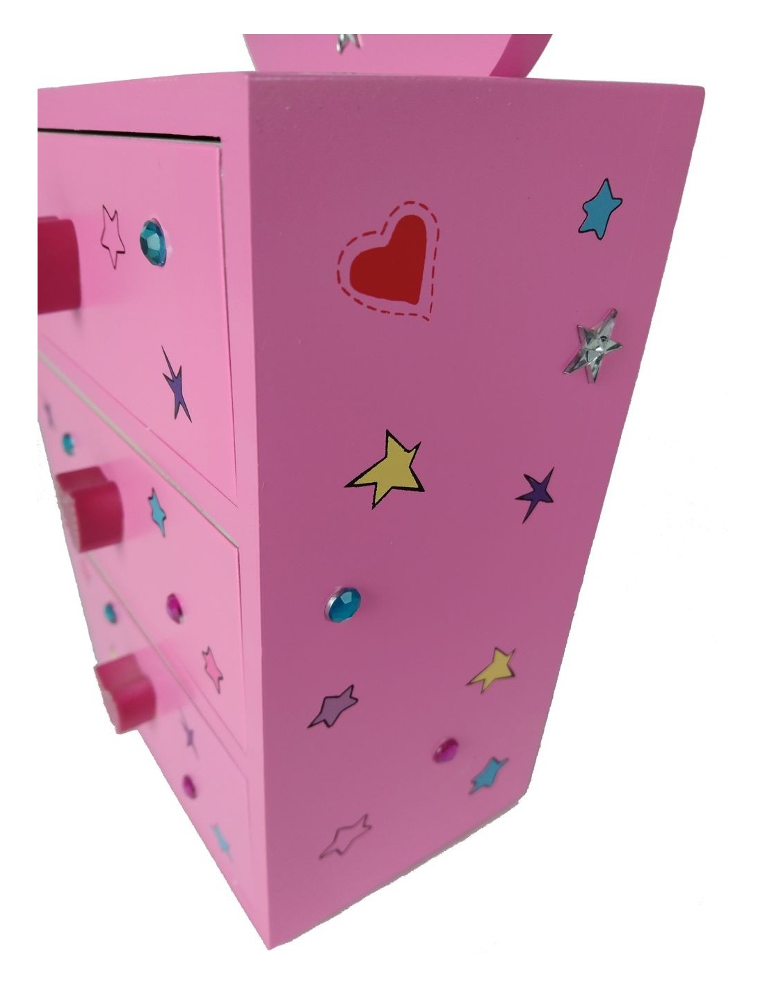 Calaixera de fusta, joier color rosa amb marc portafotos i aplicacions pedreria.