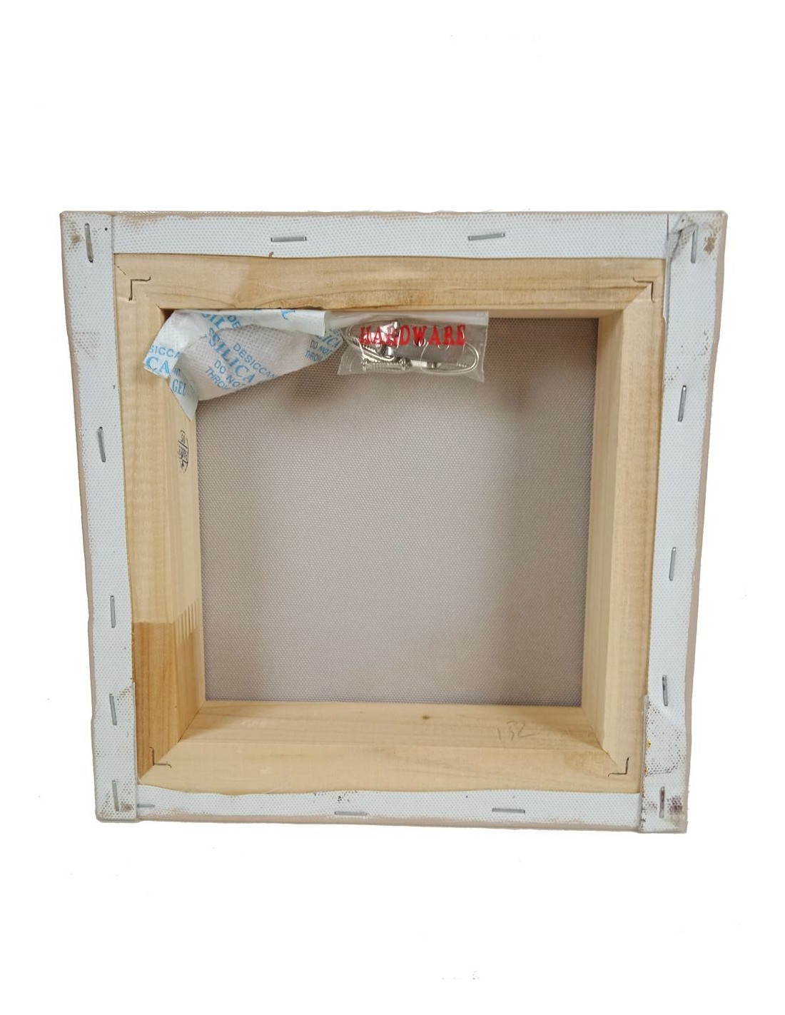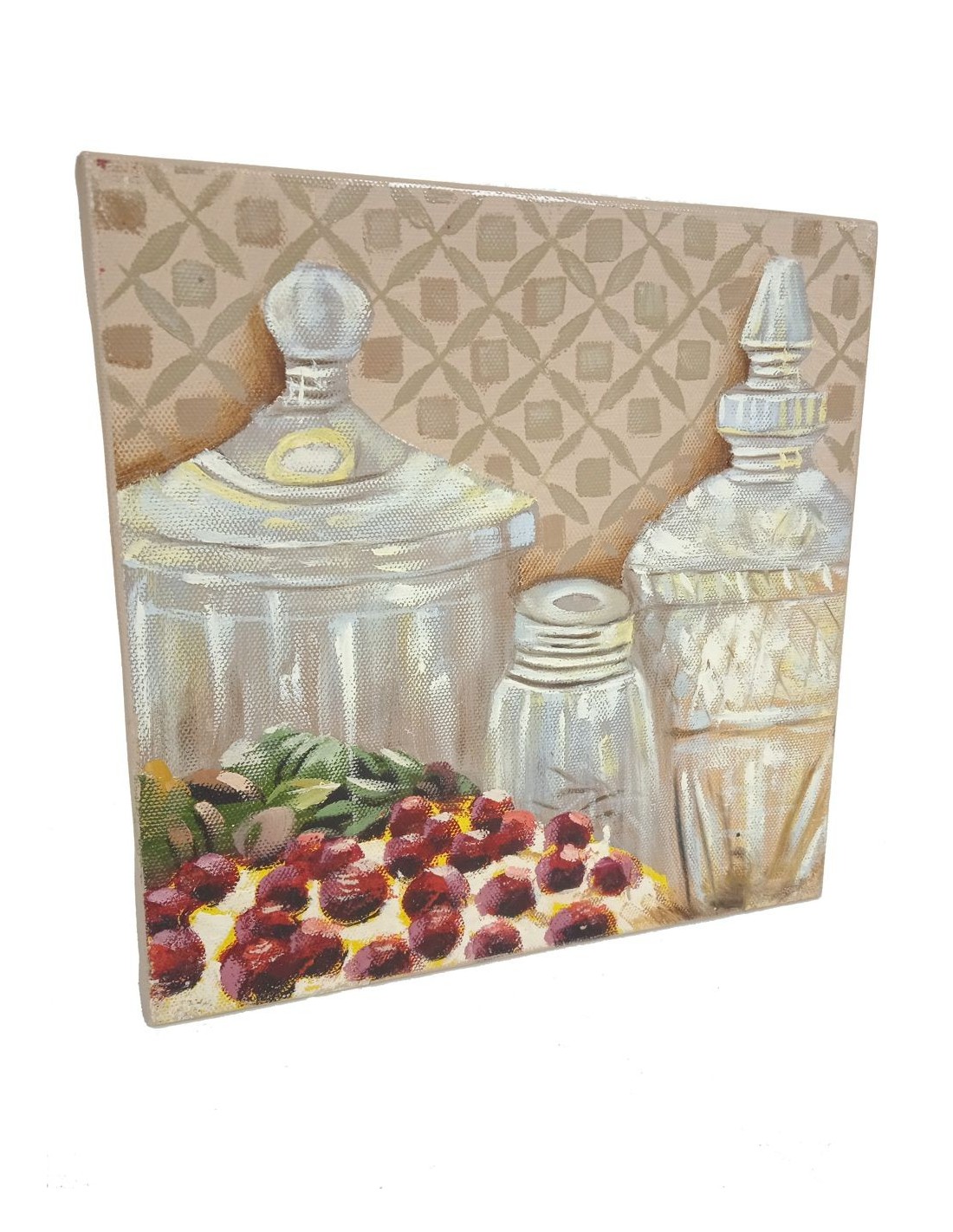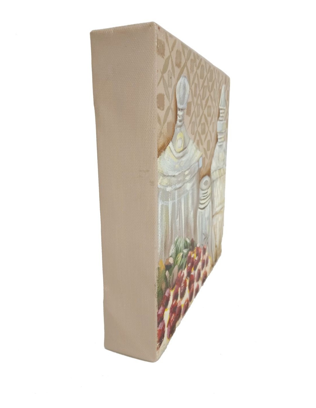 Quadre petit a l'oli sobre llenç de disseny bodegó, quadre per decorar paret a la llar. Mides: 20x20x4 cm.