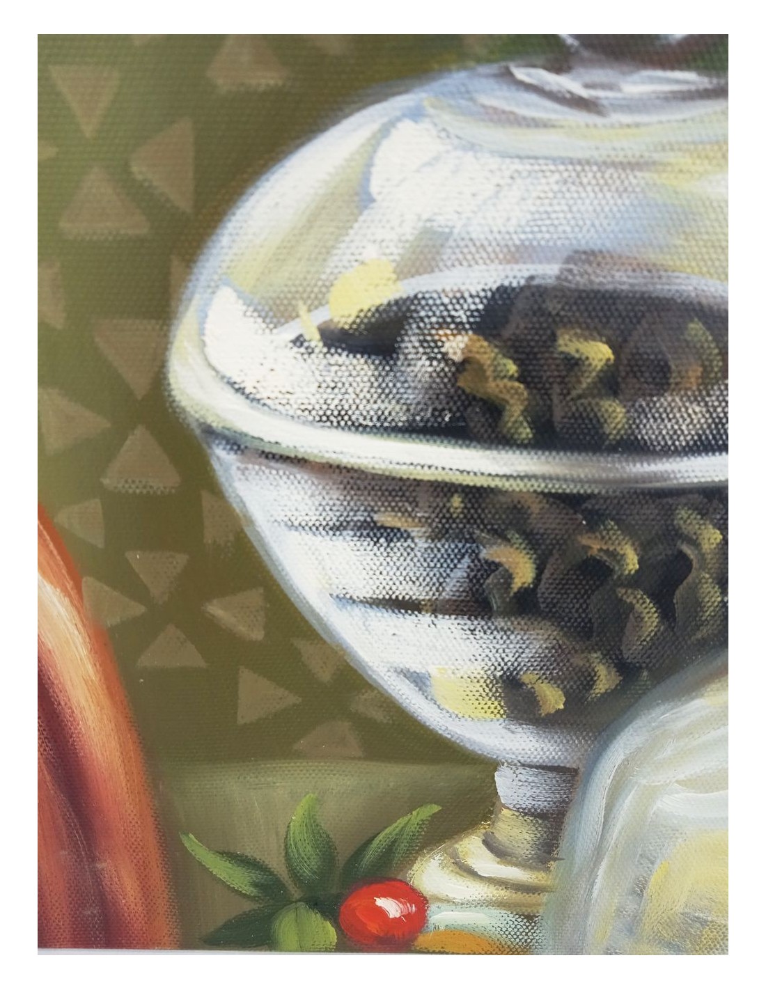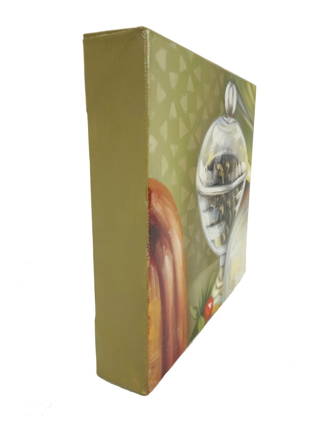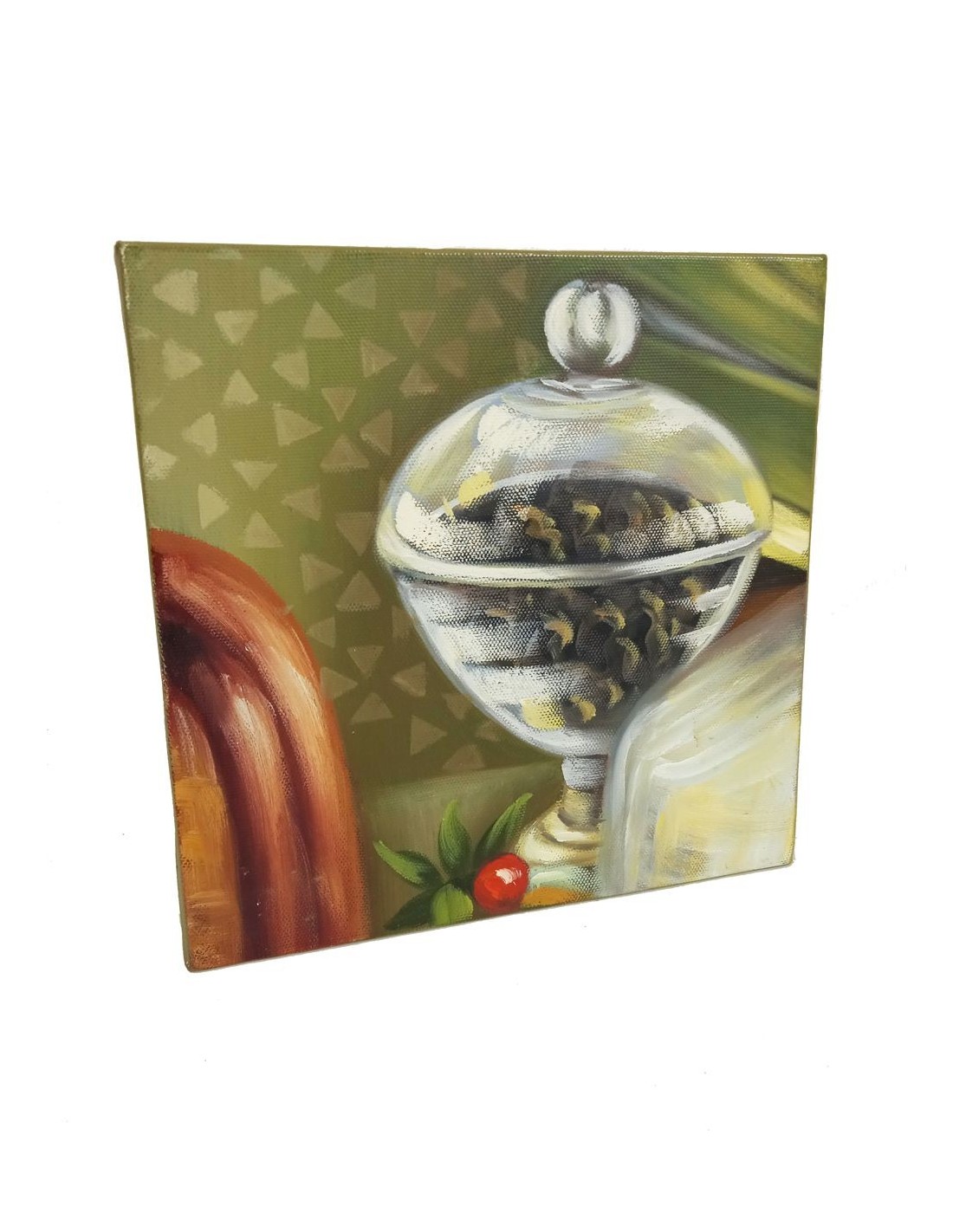 Quadre petit a l'oli sobre llenç de disseny bodegó, quadre per decorar paret a la llar. Mides: 20x20x4 cm