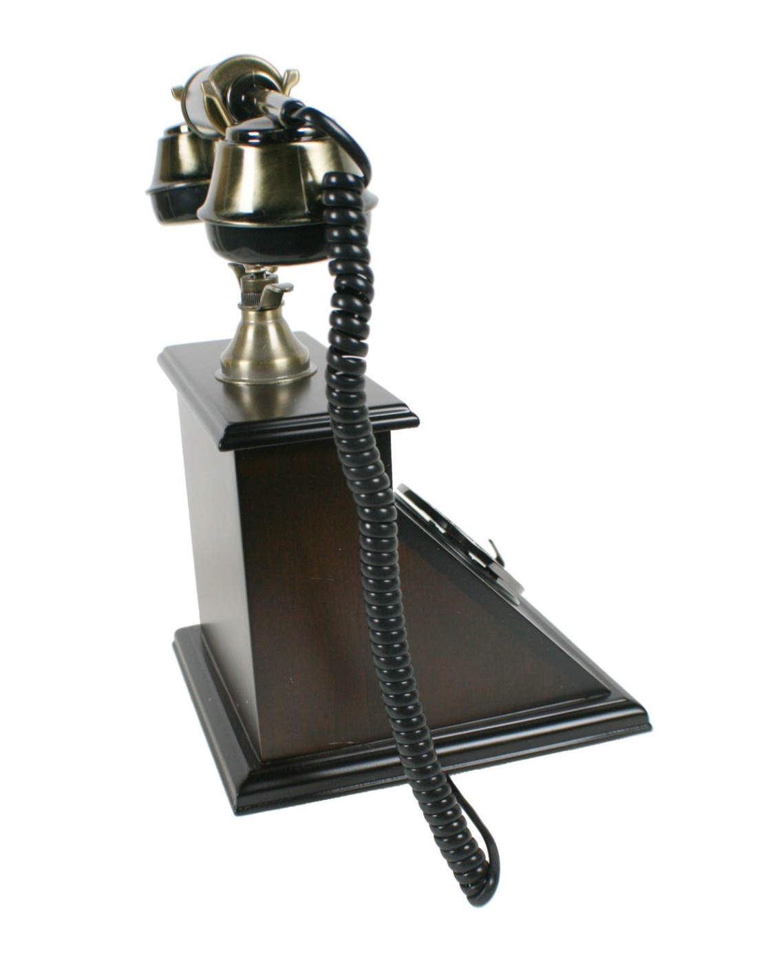 Telèfon de sobretaula de fusta amb nostàlgia dels anys 20. Combina la tecnologia moderna amb un encant antic gràcies al seu dial giratori. Una peça essencial per a una decoració autènticament vintage