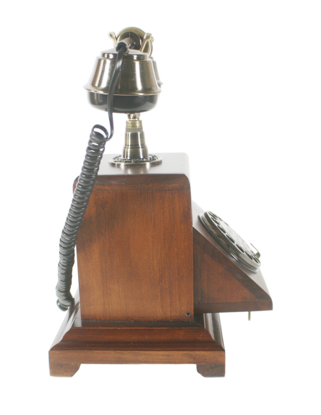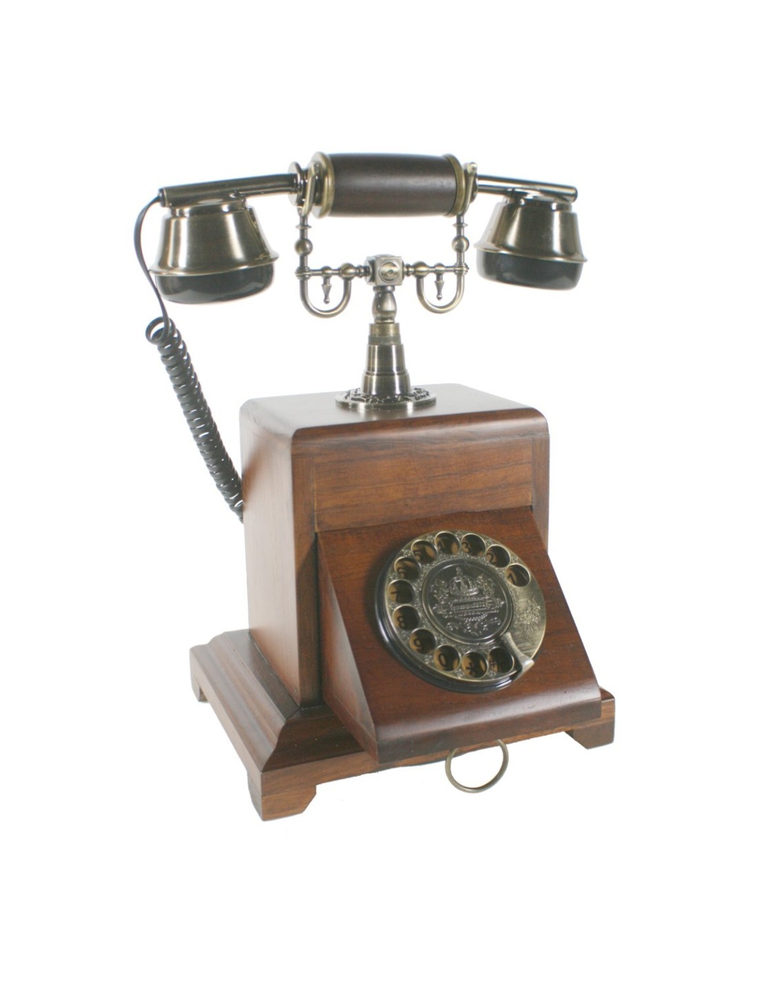 Aquest telèfon d'estil vintage combina amb la tecnologia actual i amb l'encant dels anys 20. Té un elegant disseny de fusta i metall llautó amb un dial giratori amb la particularitat que el pots amagar de forma simple.