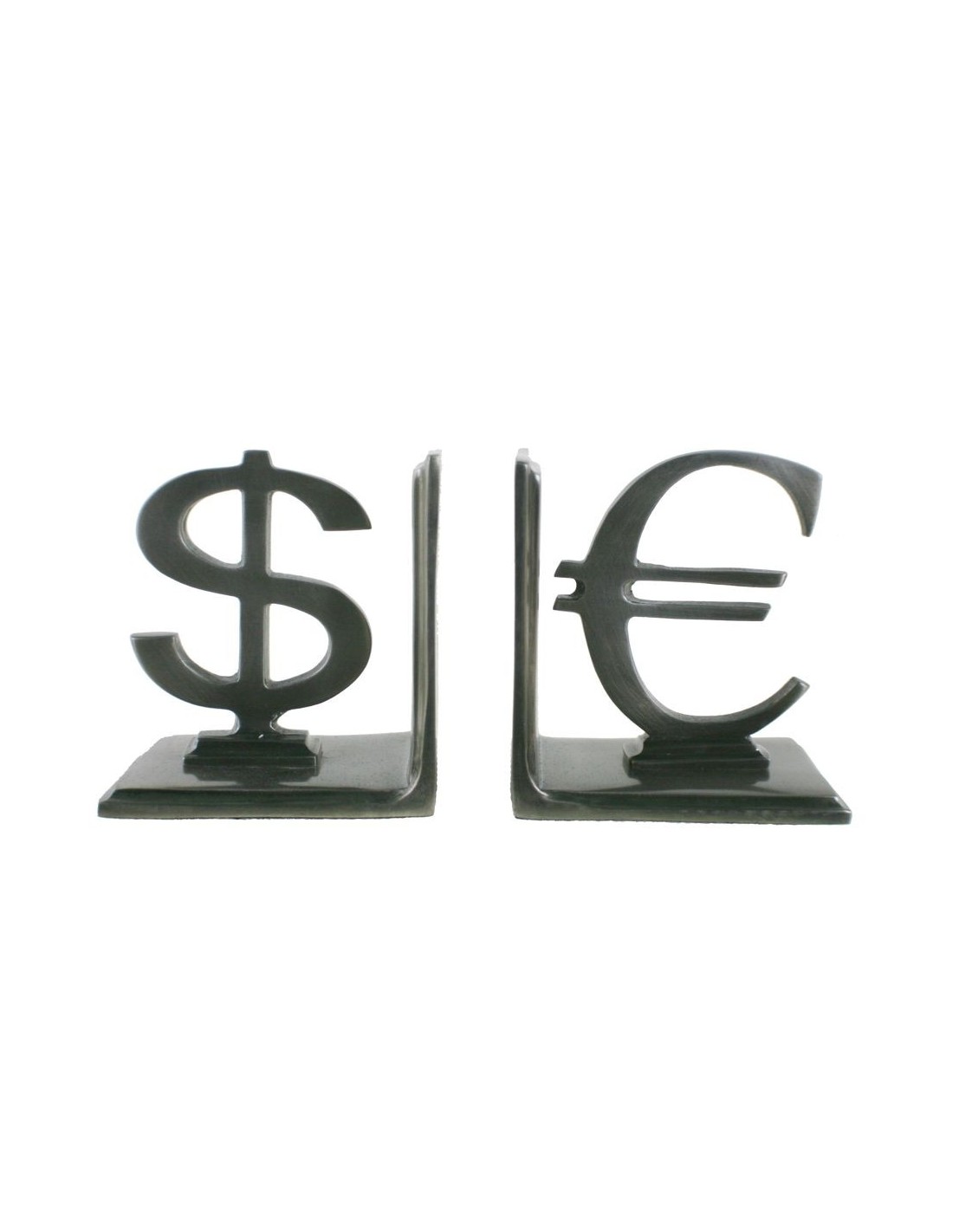Subjecta llibres metàl·lic dòlar- Euro acabat en gris setinat (conjunt de dos). Un accessori indispensable en qualsevol llibreria o prestatgeria de llibres.