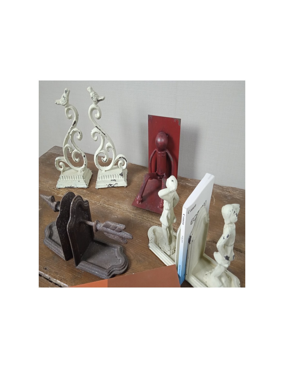 Joc de dos recolza llibres fets de ferro colat acabat envellit color crema i construcció molt reforçada per decorar la teva prestatgeria.