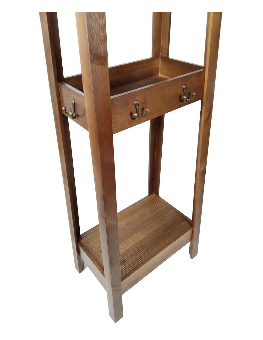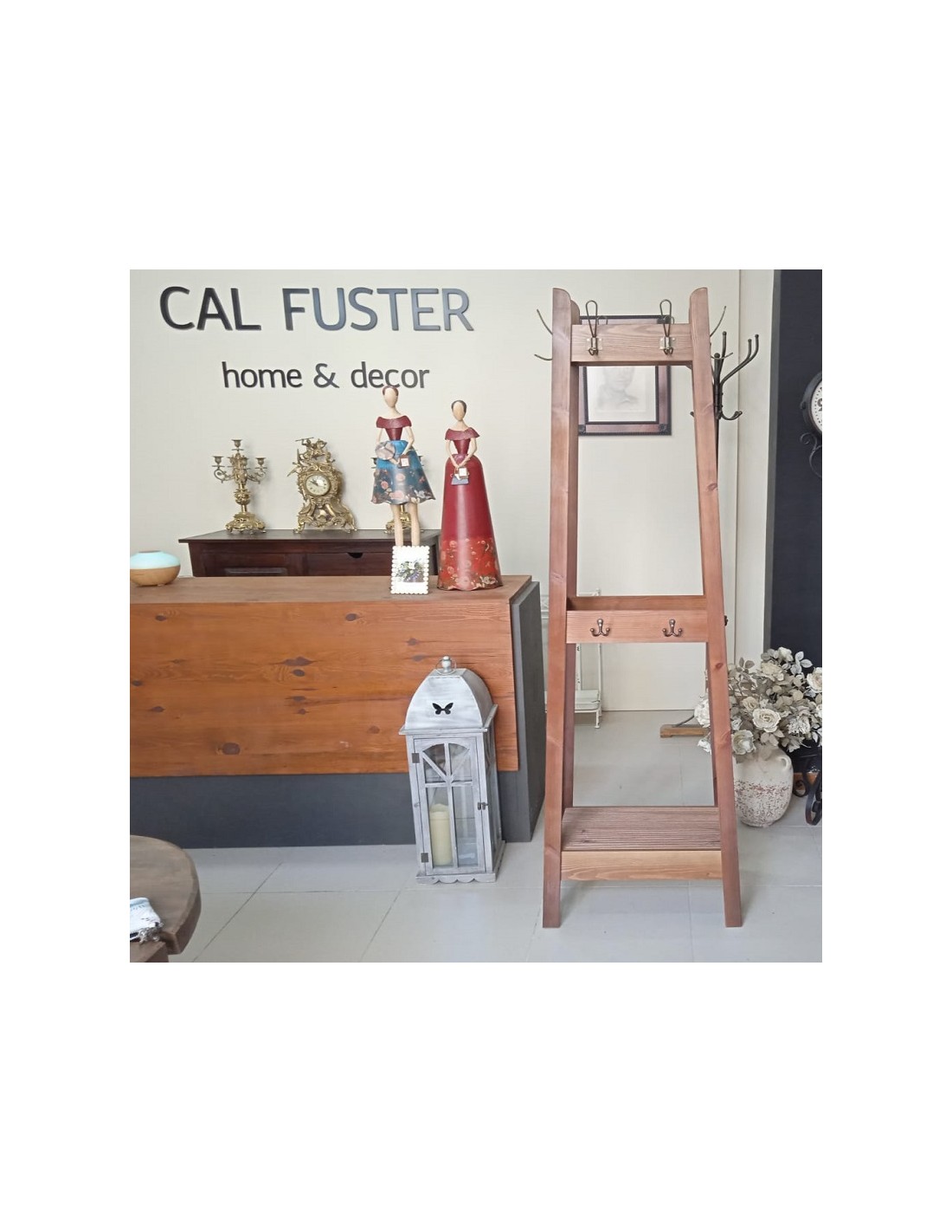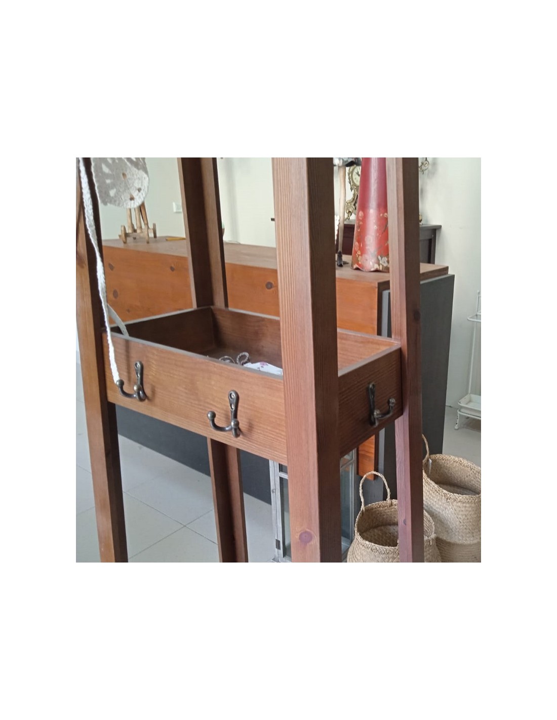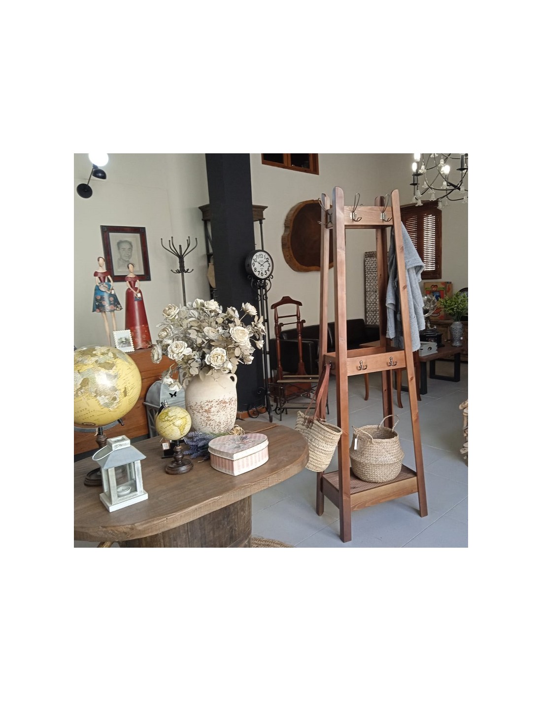 Penjador de peu de fusta massissa color noguer, amb 6 ganxos per a abrics, ganxos per a bosses, prestatges, butxaques i zona per a sabates. Ideal per donar-li un toc rústic i acollidor a casa teva.