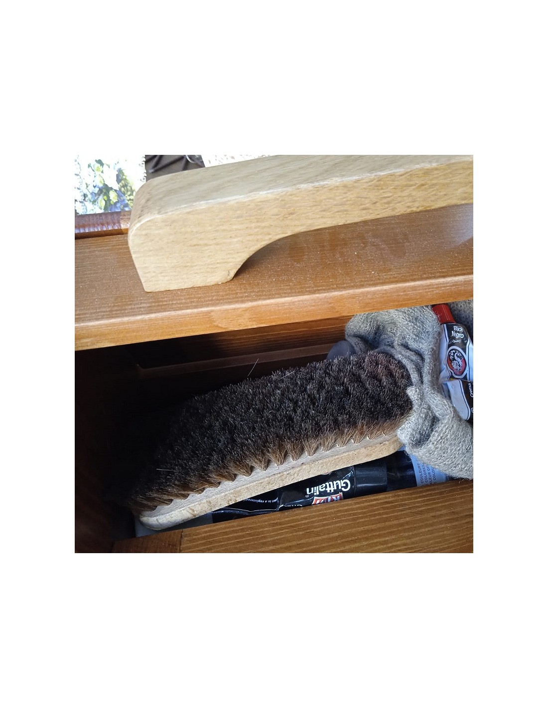 Aquesta encantadora caixa de fusta massissa tenyida de color avellana és el complement perfecte per mantenir en ordre els teus estris de neteja de calçat. Feta a mà amb amor per Cal Fuster i amb una producció limitada, és ideal per regalar o per donar a casa teva un toc de calidesa i organització.