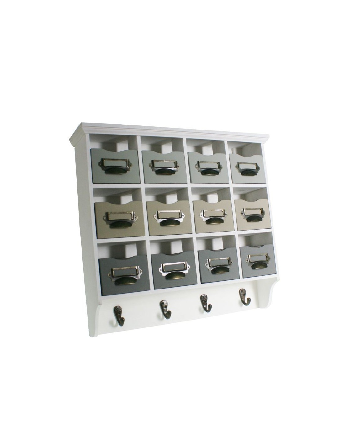Amb els seus dotze calaixos en tons grisos i el penjador inferior amb quatre penjadors, és ideal per mantenir tot al seu lloc: claus, bufandes, fils de costura, petits accessoris… Tot ben classificat ia mà!