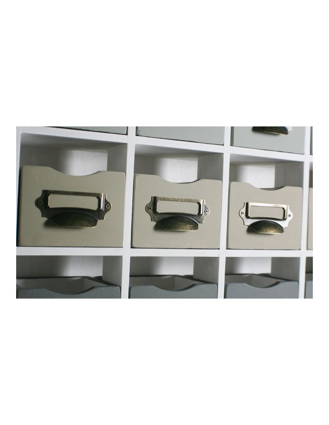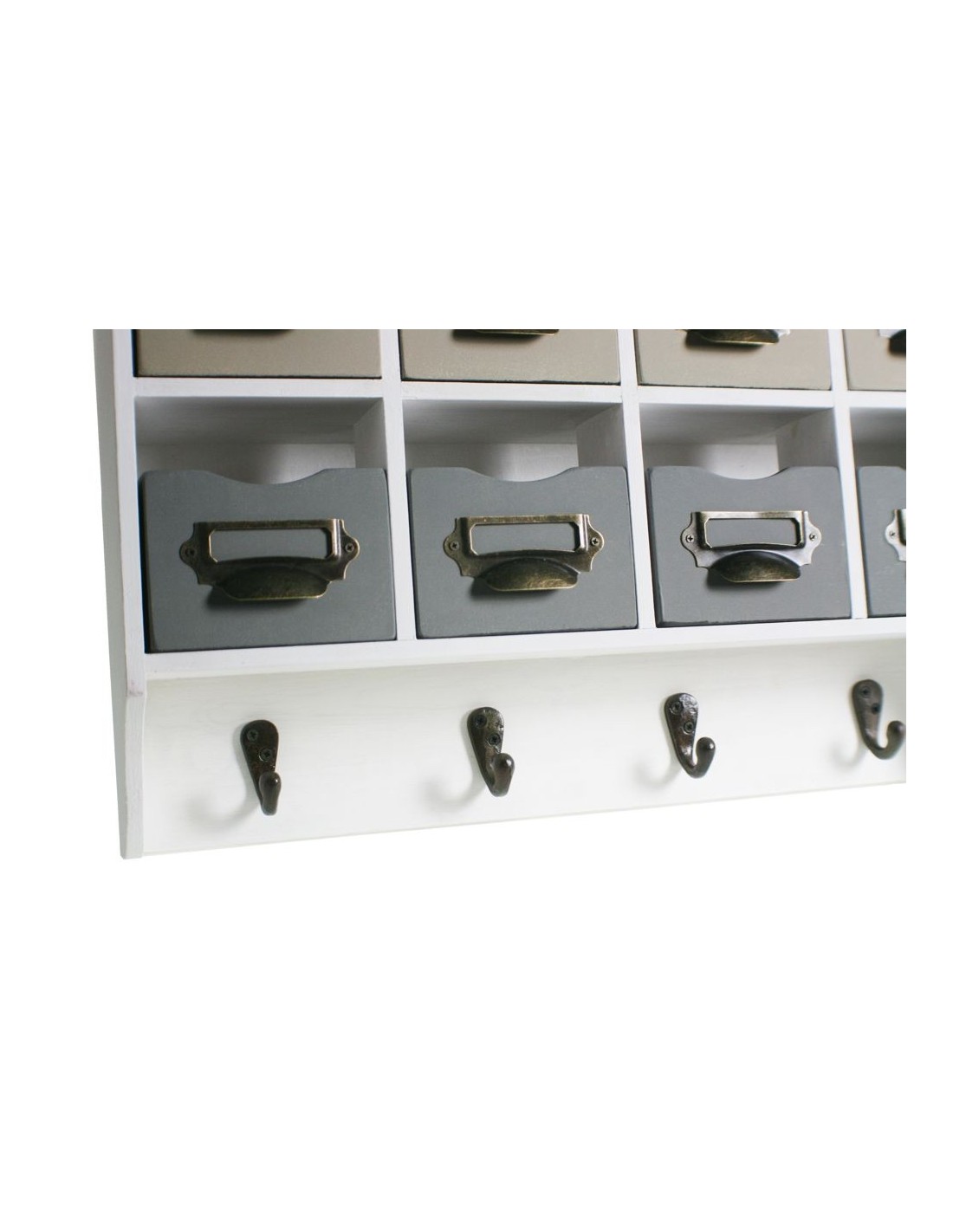 Calaixera de fusta per penjar amb dotze calaixos i penjador inferior. Estil rústic vintage en tons blancs i grisos. Ideal per organitzar i decorar.