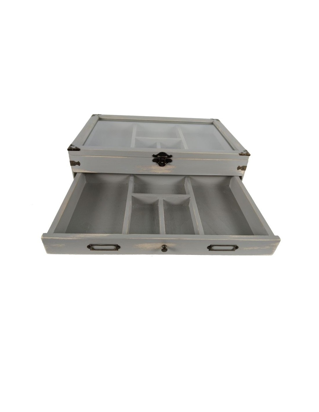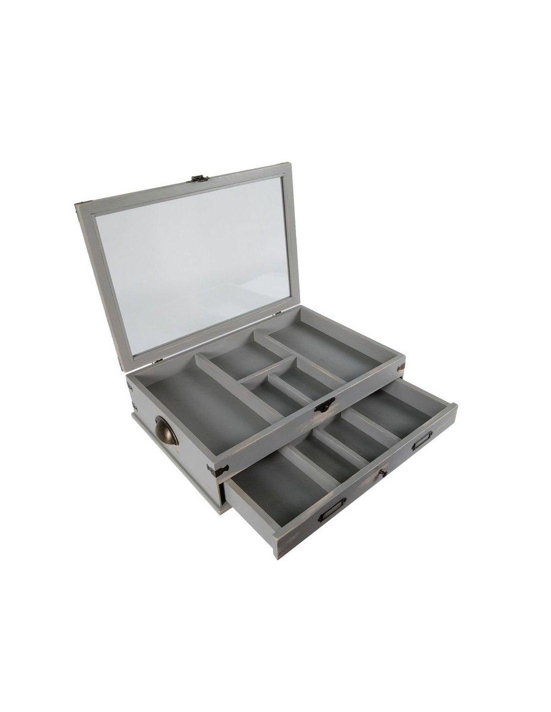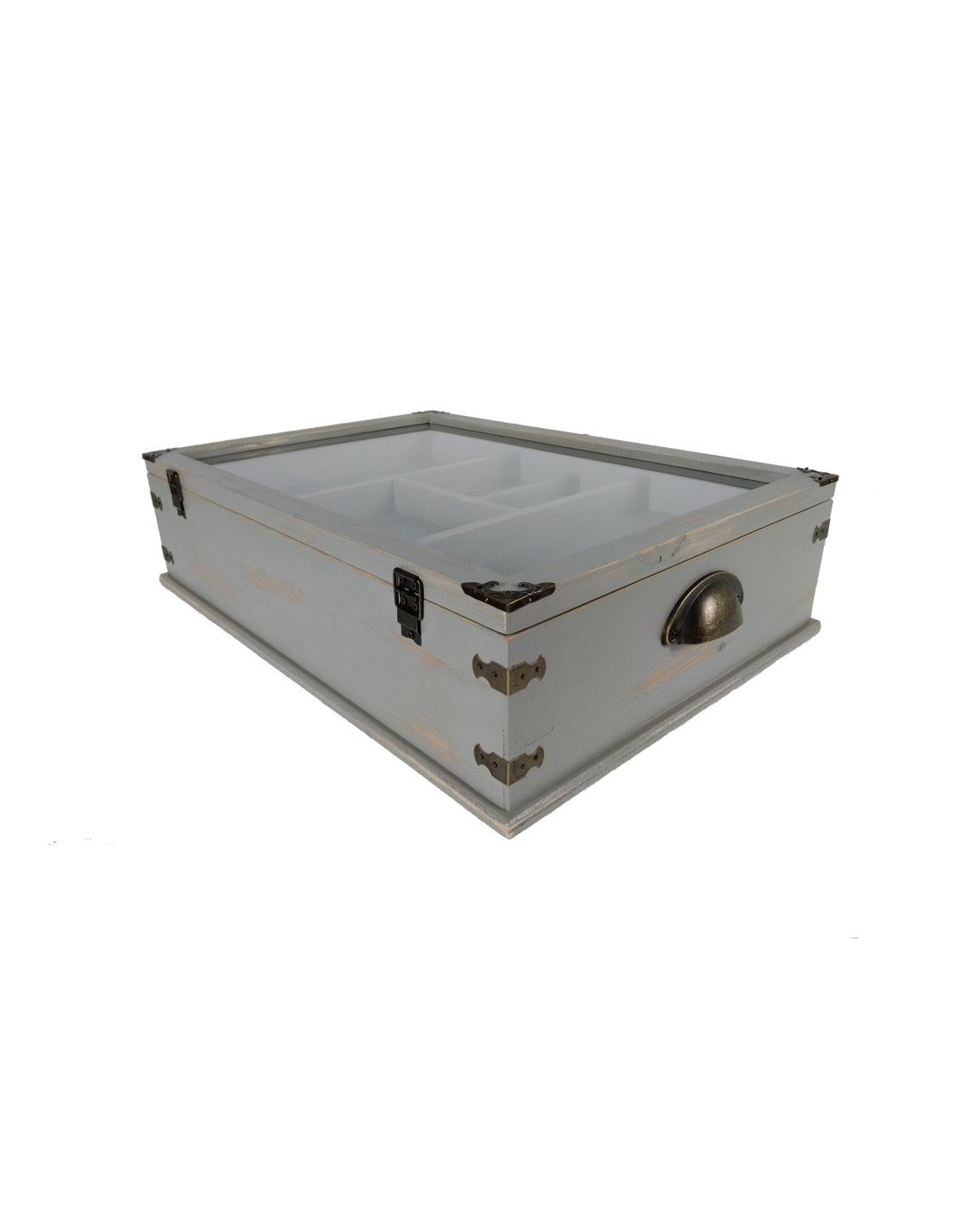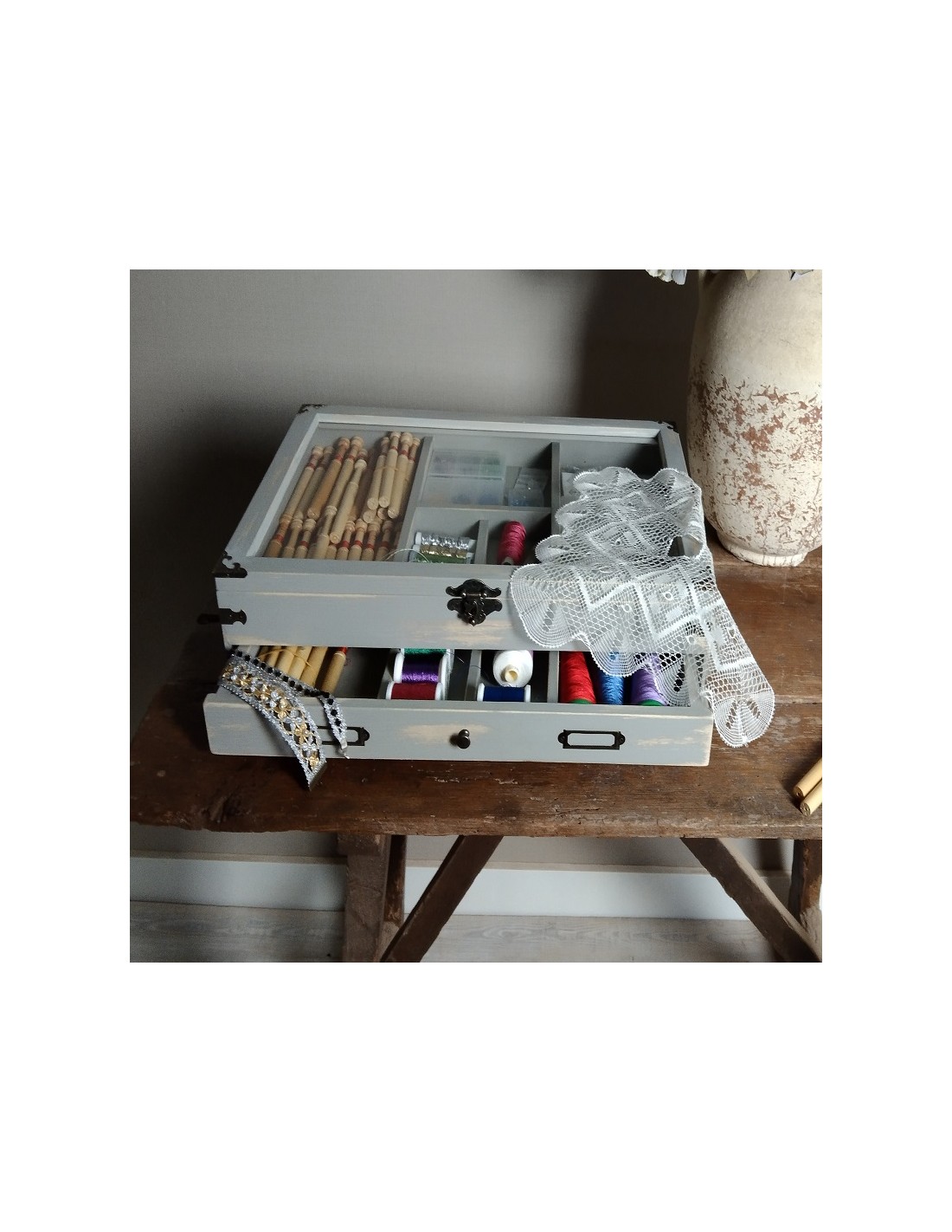 Gran cosidor de fusta amb tapa transparent i calaix inferior. Total deu compartiments de diferents mides, cinc a la part superior i cinc al calaix. Ideal per al món dels boixets, ja que permet posar tota mena d'utensilis per a la creació de les teves labors. És una caixa que et decorarà el teu racó de labors a casa teva. També el podeu utilitzar com a caixa d'ordenació. Efectuada amb fusta massissa estil rústic i pintada a l'aigua. Un regal especial per a les bolilleres i cosidores. Fabricació artesanal i nacional.
