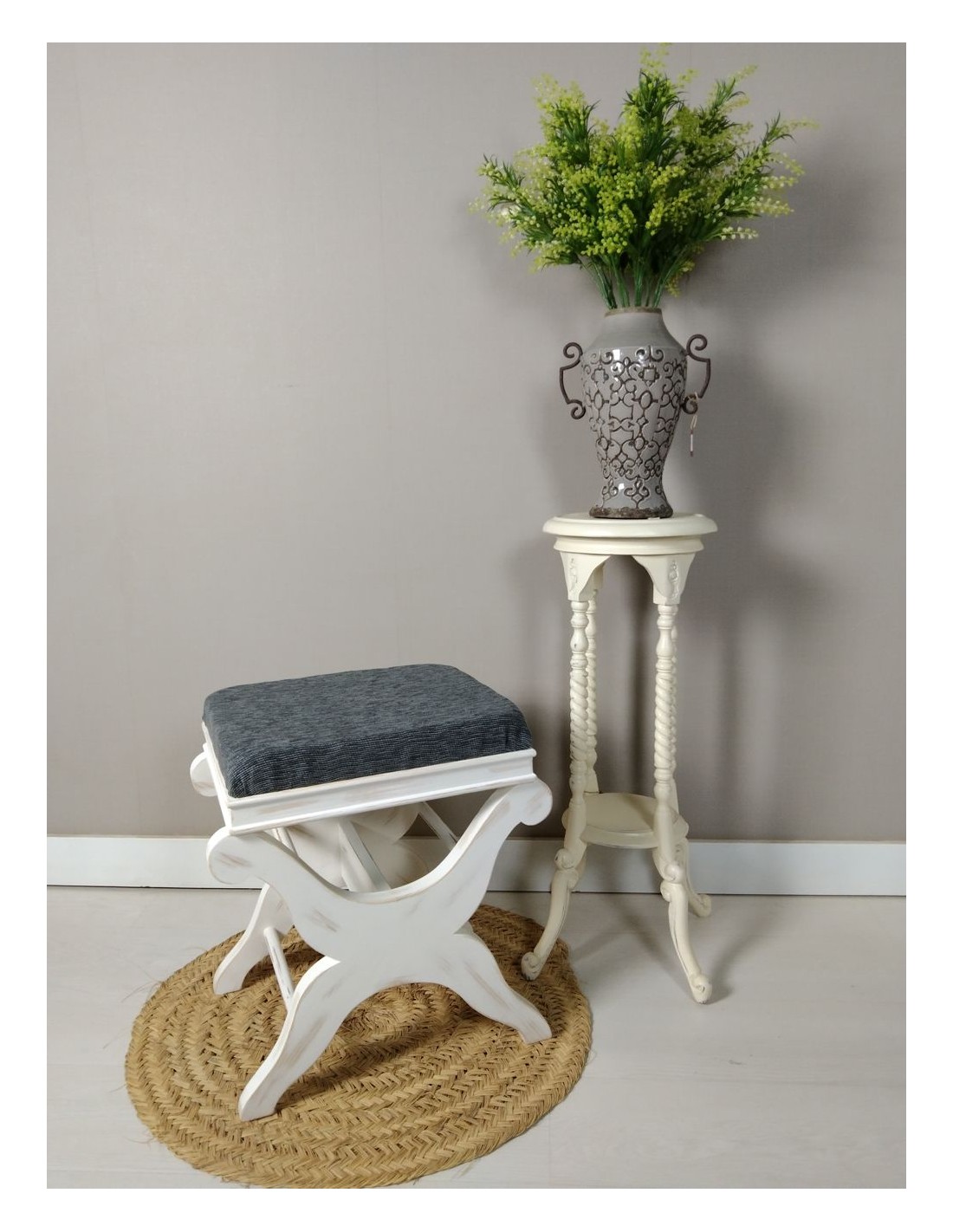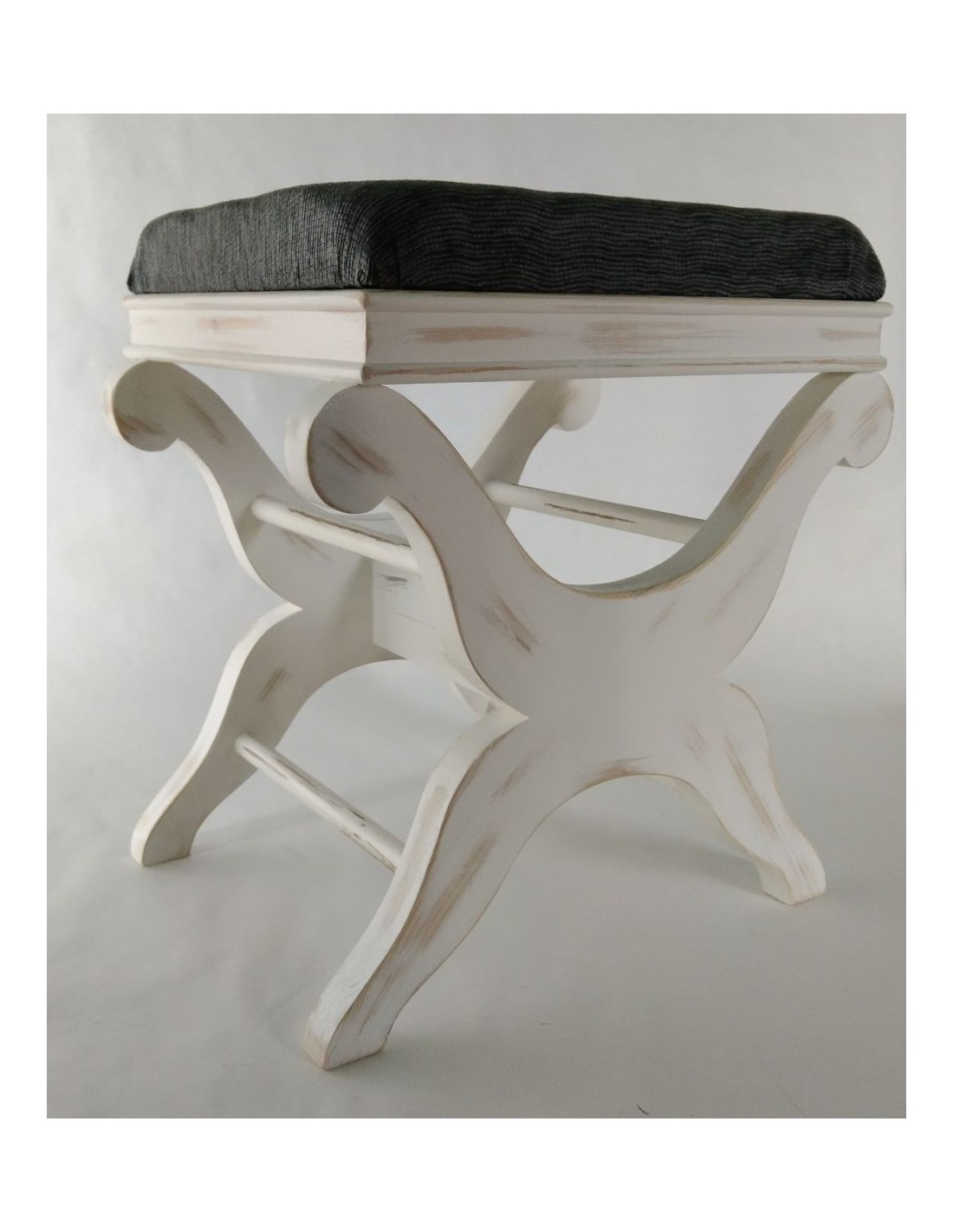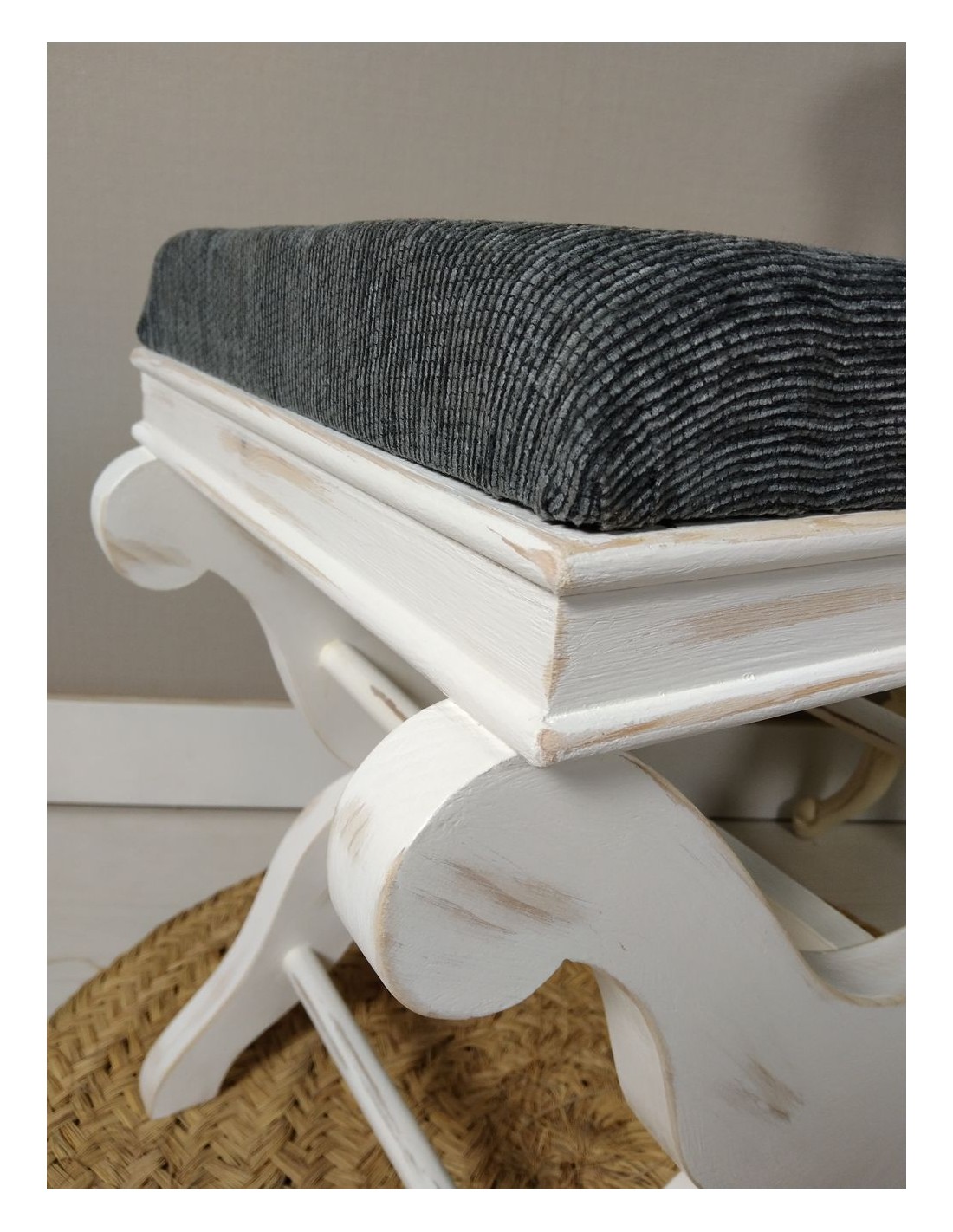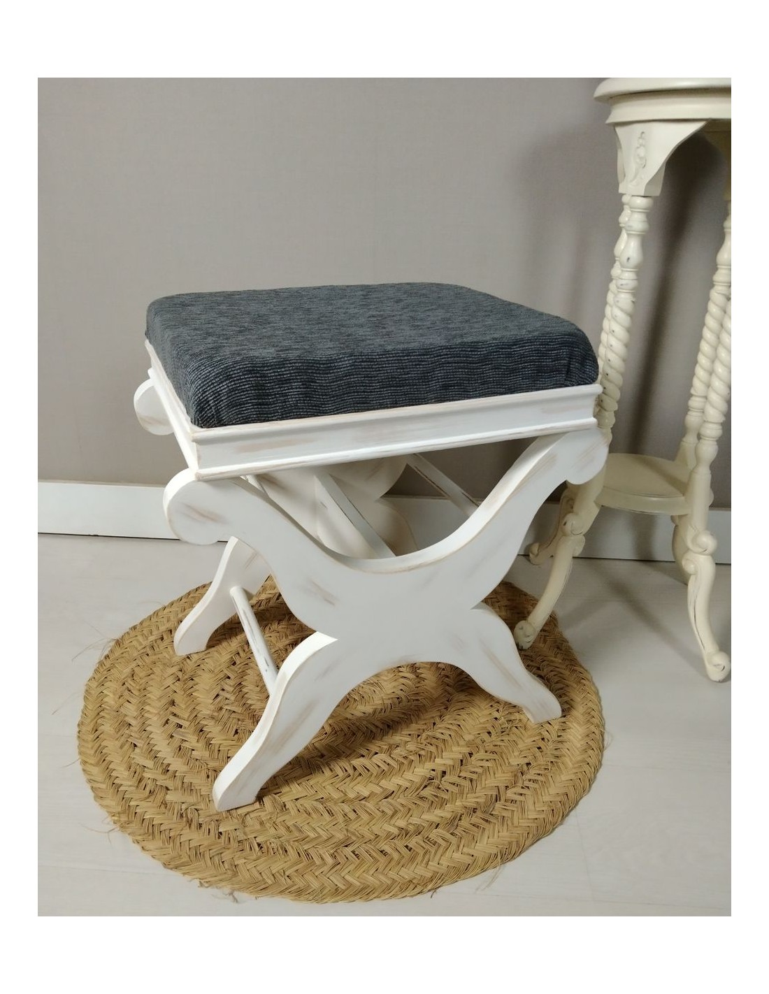 Descobriu l'elegància dels mobles amb ànima. Aquest reposapeus ha estat elaborat artesanalment al nostre taller amb fusta massissa i un delicat acabat blanc envellit que realça el seu estil vintage. El seient, entapissat en un suau to gris, aporta confort i personalitat a qualsevol racó de la llar.