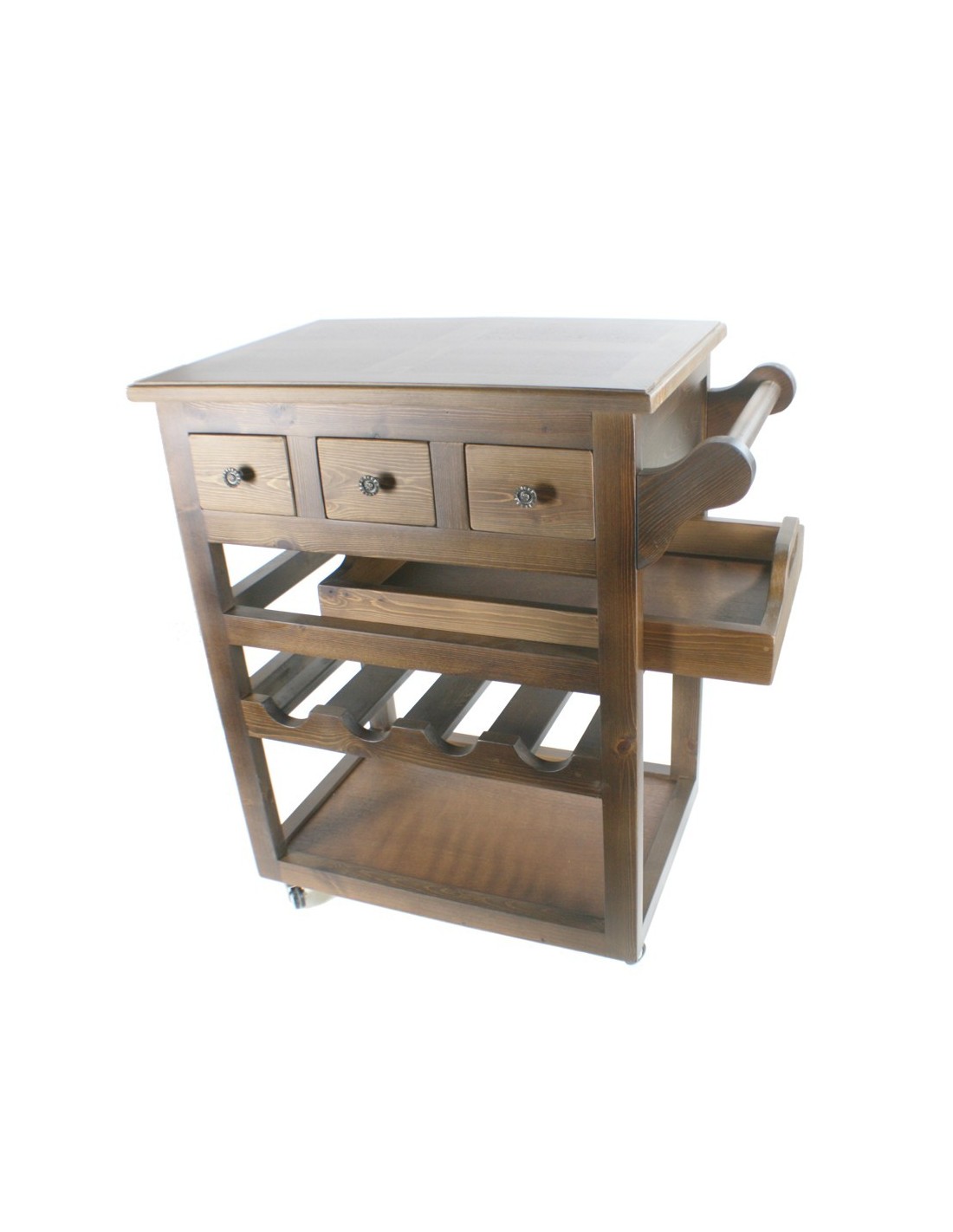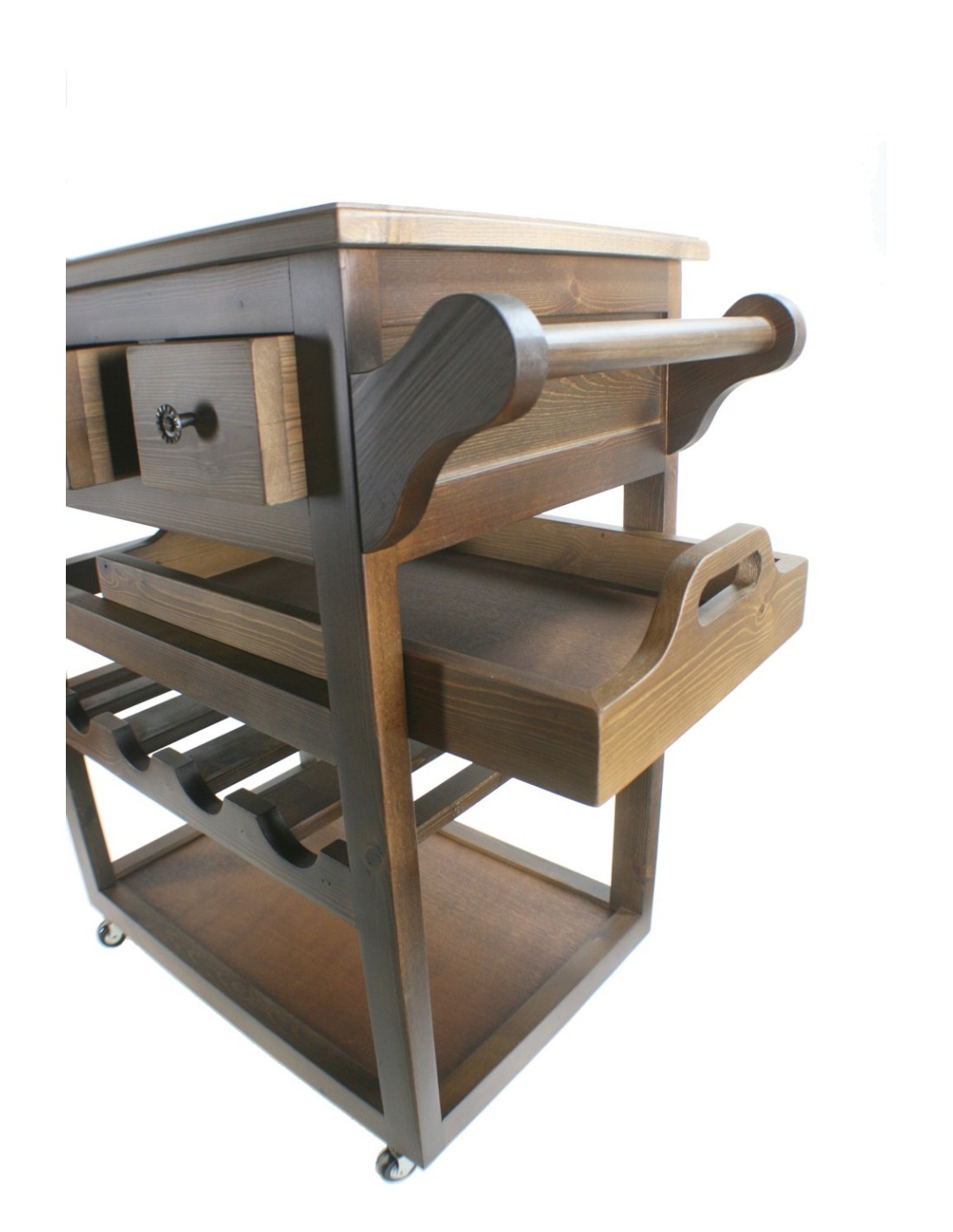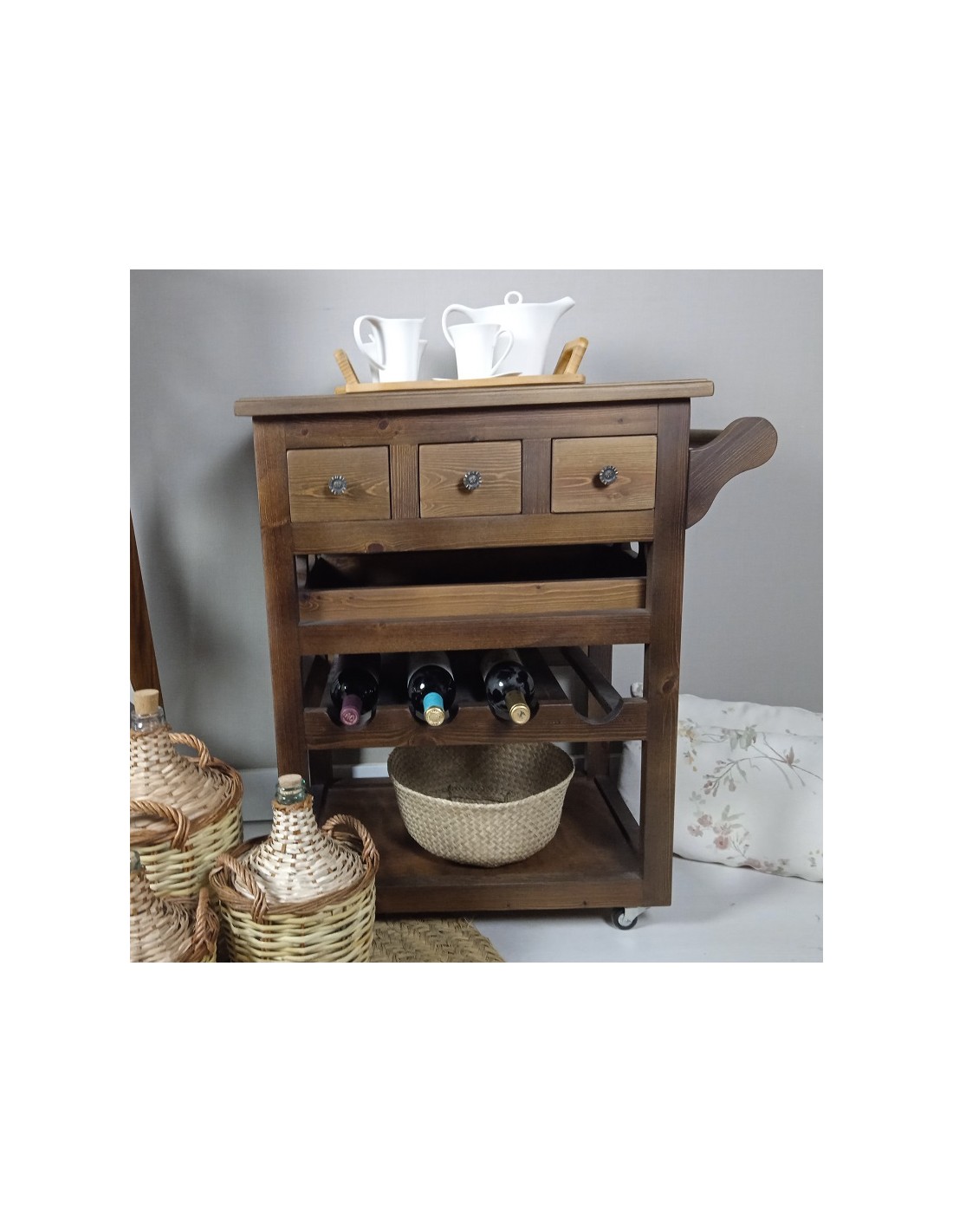 Cistella cambrera de cuina en fusta massissa de pi envernissat en color castany mat. Dissenyat amb safata extraïble, boteller i tres calaixos, és un moble auxiliar ideal per a cuina, menjador o sala d'estar. Elaborat artesanalment a Cal Fuster, la seva producció és limitada, garantint exclusivitat i qualitat.