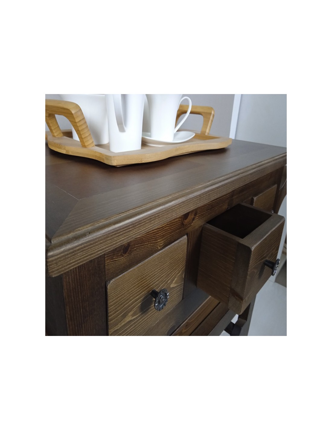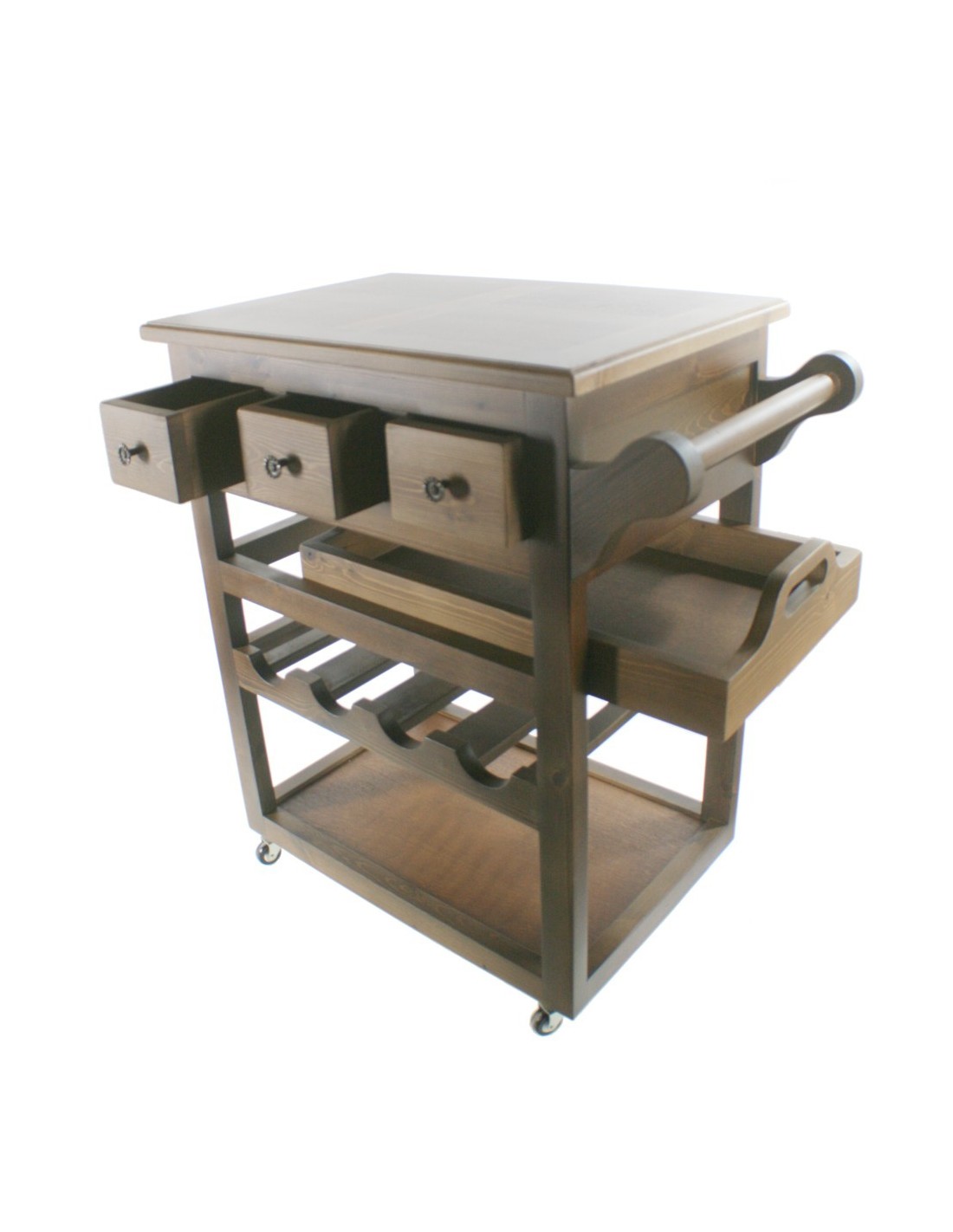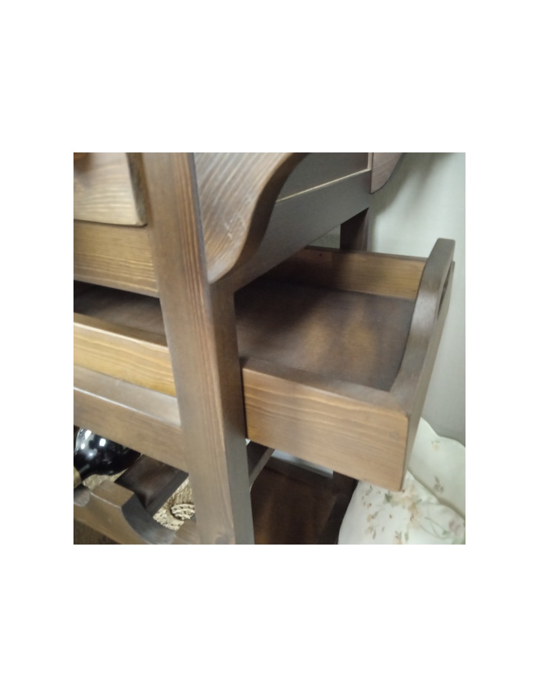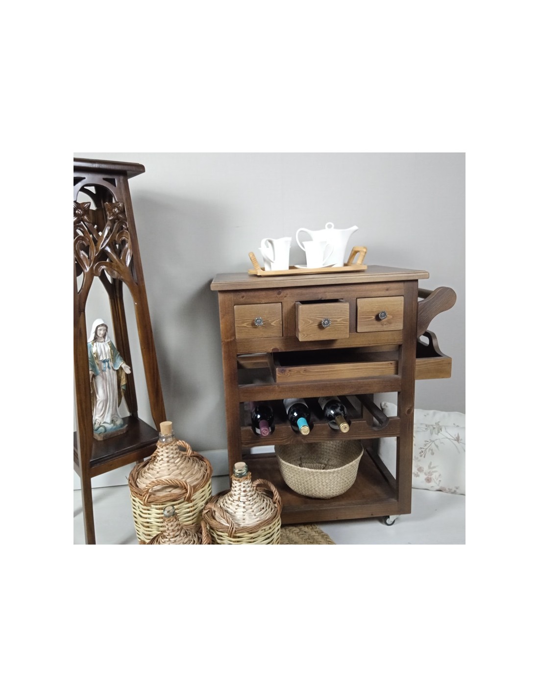 Cistella cambrera de cuina en fusta massissa de pi envernissat en color castany mat. Dissenyat amb safata extraïble, boteller i tres calaixos, és un moble auxiliar ideal per a cuina, menjador o sala d'estar. Elaborat artesanalment a Cal Fuster, la seva producció és limitada, garantint exclusivitat i qualitat.