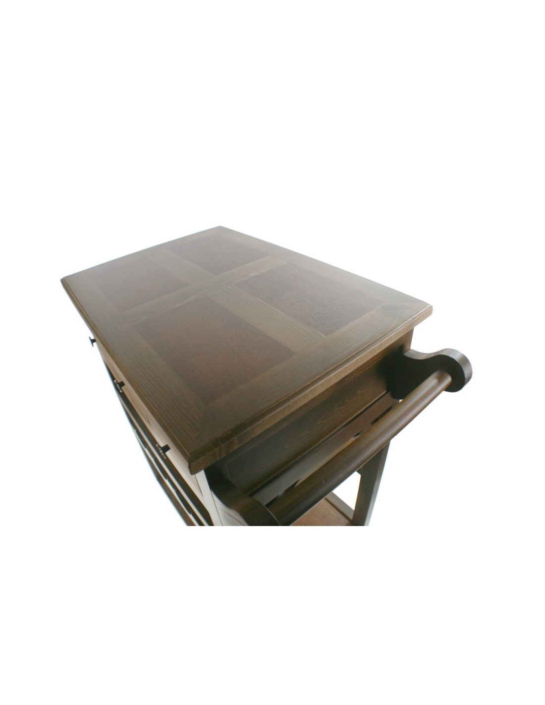 Aquest carro cambrera no només és funcional, sinó que també aporta un toc rústic i elegant a qualsevol estança. Fabricat amb fusta massissa de pi amb acabat envernissat mat, el seu disseny és robust i durador.