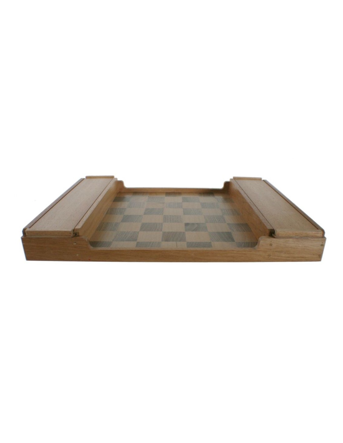 Un tauler artesanal de fusta massissa envernissada al natural, amb disseny retro i compartiments laterals per guardar-hi les fitxes. Ideal per als amants dels escacs i les dames que busquen qualitat i elegància en un mateix producte.