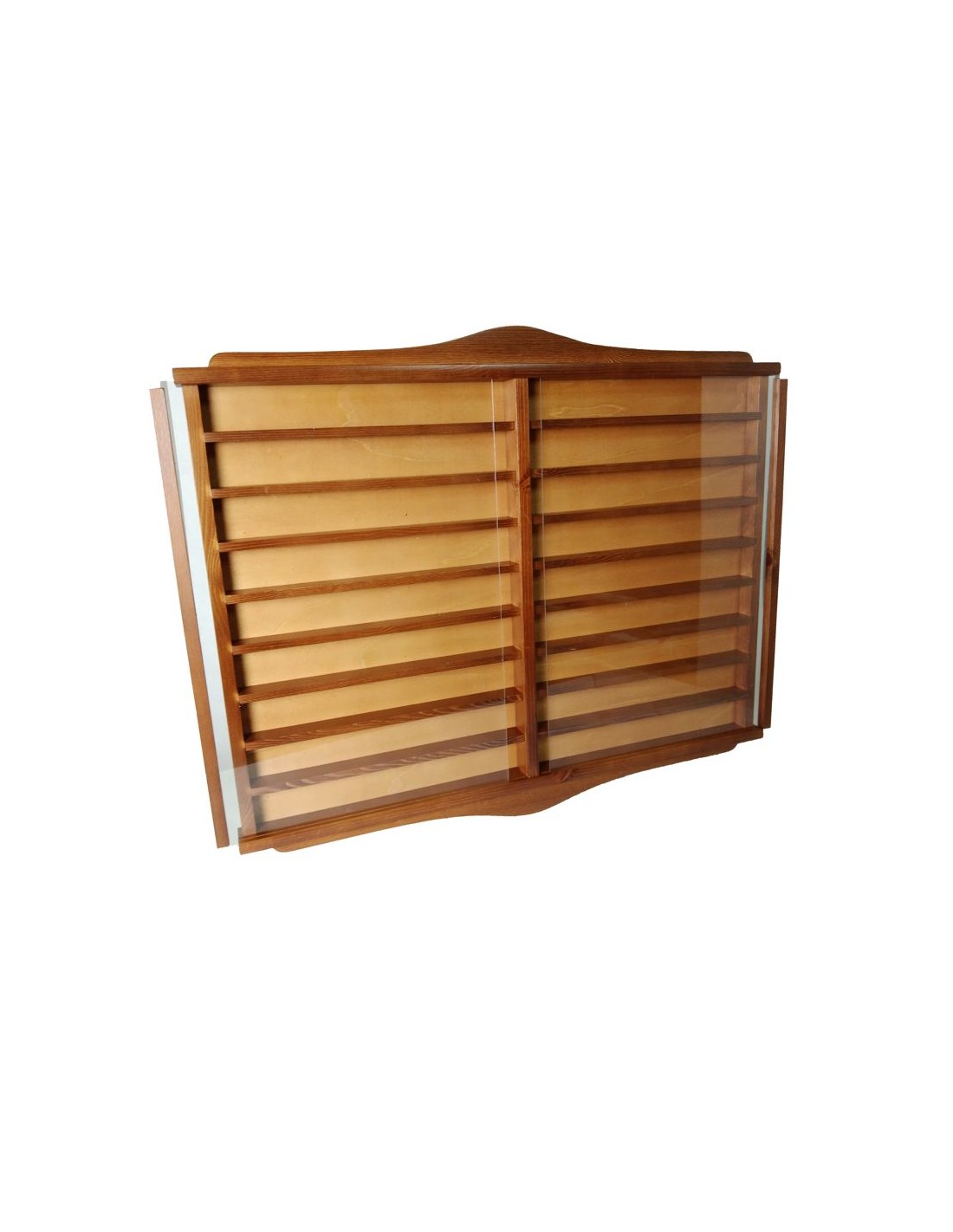 Vitrina expositora de fusta massissa amb capacitat per aproximadament 250 didals. Disseny elegant amb portes corredisses de metacrilat, ideal per penjar a la paret i protegir la teva col·lecció. Un regal perfecte per a col·leccionistes de didals o miniatures.