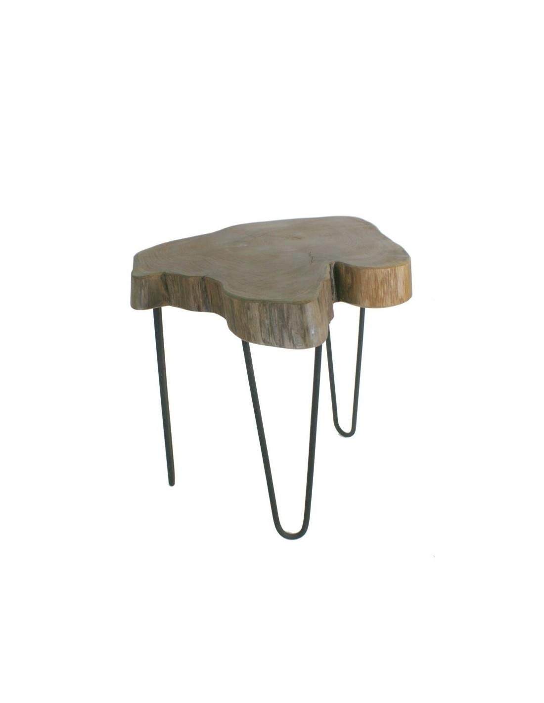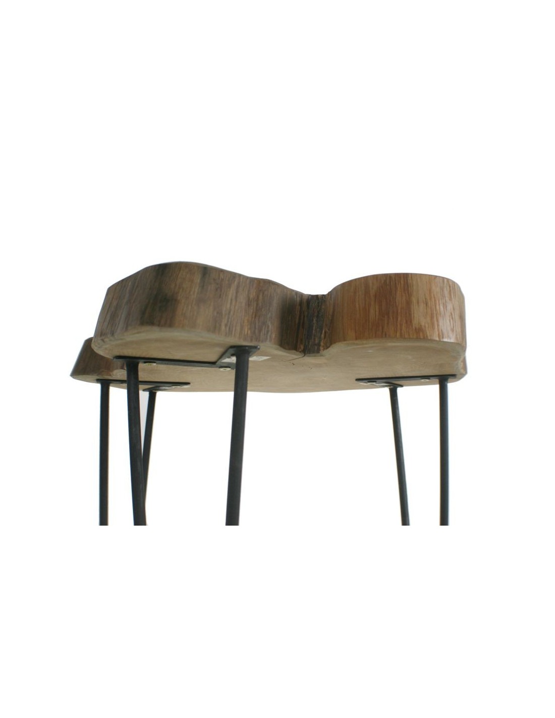 Taula auxiliar de disseny natural amb sobre irregular en fusta de teca de 6 cm de gruix i tres potes metàl·liques negres. Ideal com a tauleta de nit o taula de centre petita per a la teva sala d'estar.