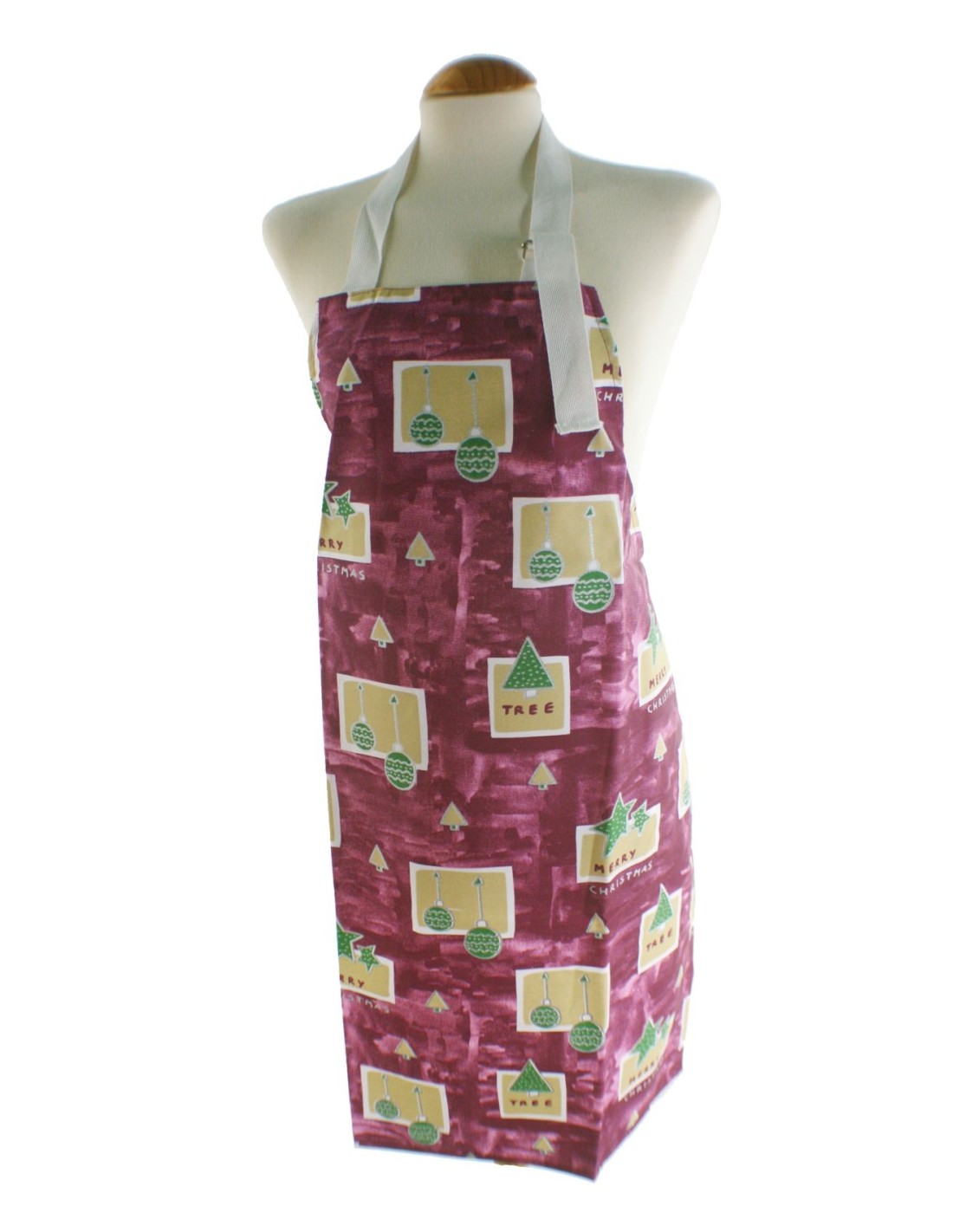 Davantal per a cuina amb disseny Nadalenc de color lila estampat boles i peto ajustable. Mesures: 80x65 cm.