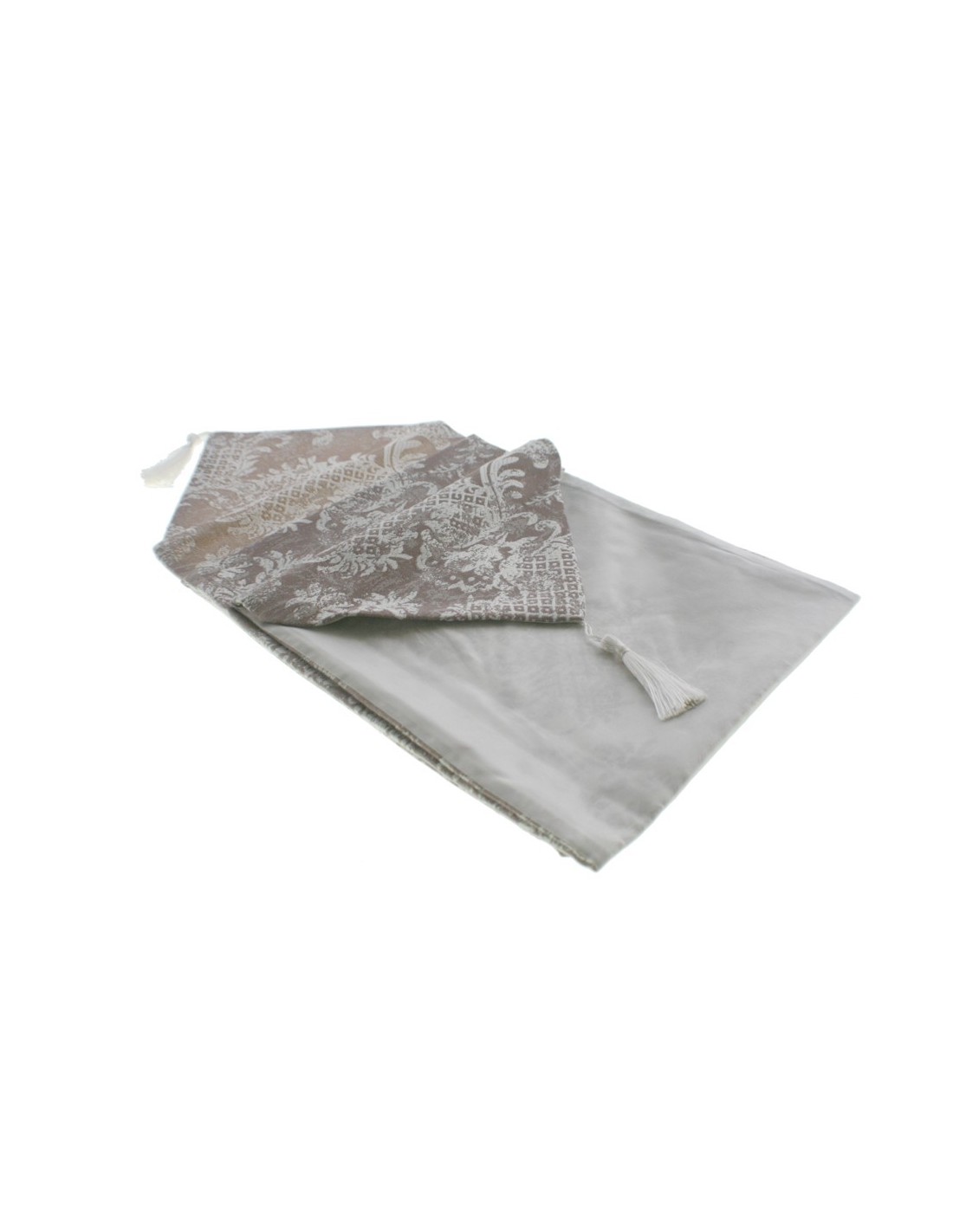 Camí de taula estampat decoratiu color beix púrpura reversible amb serrells. Mesures: 32x180 cm.