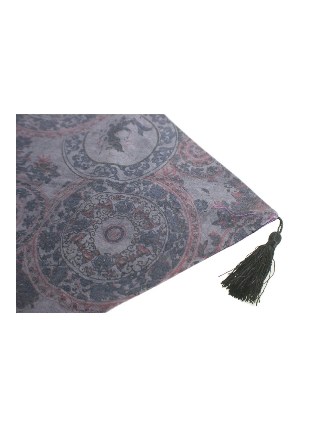Camí de taula estampat decoratiu color lila reversible amb serrells. Mesures: 31x180 cm.