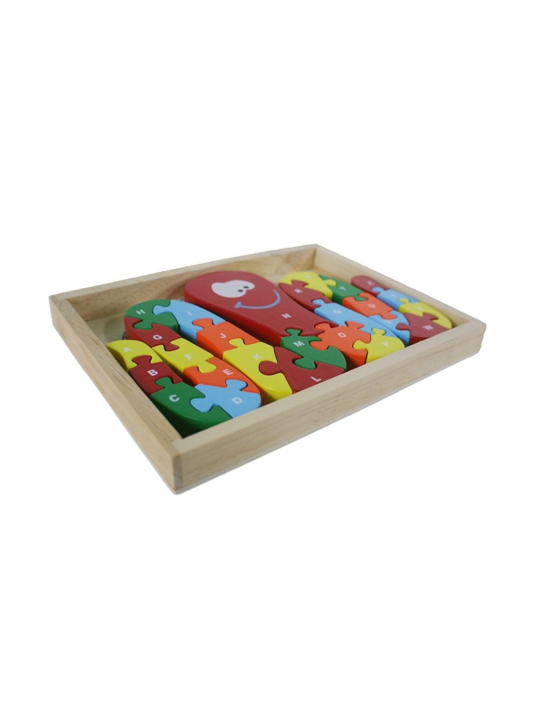 Aquest puzle de fusta amb forma de pop és una manera divertida d'aprendre l'abecedari i els números. Els seus braços mostren les lletres de l'A a la Z i, al revers, els números de l'1 al 26, combinant joc i aprenentatge en una sola peça.