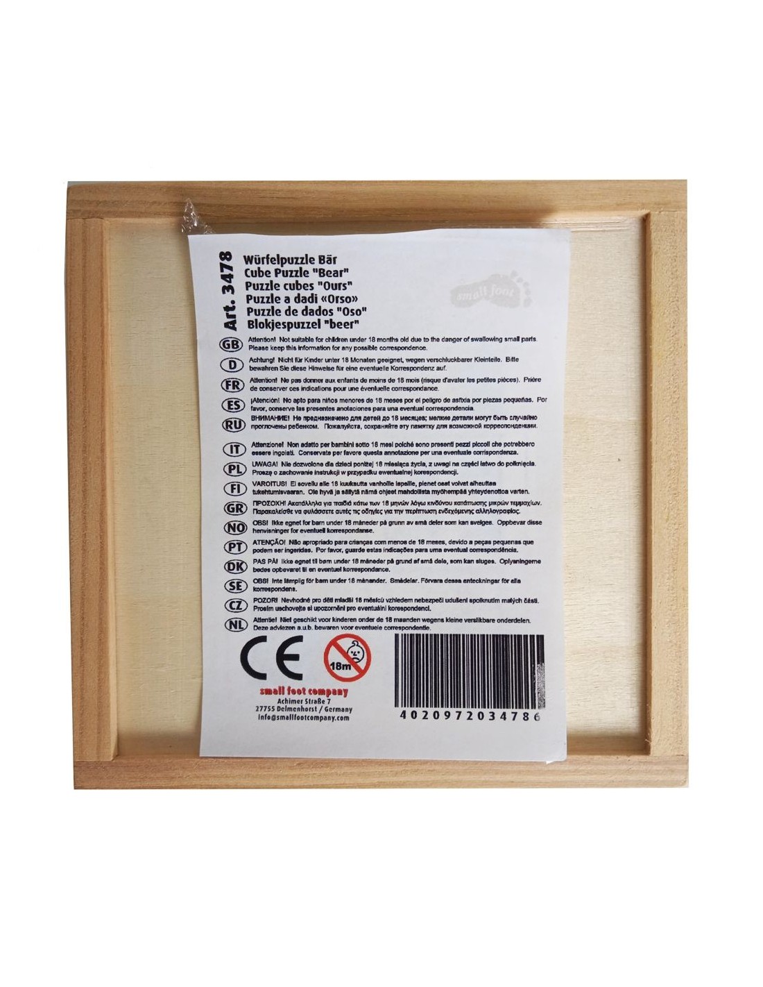 Aquest puzle de fusta inclou 9 daus que, en encaixar-los correctament, formen sis models diferents d'óssos. Un joc entretingut que combina observació, memòria i motricitat als més petits.