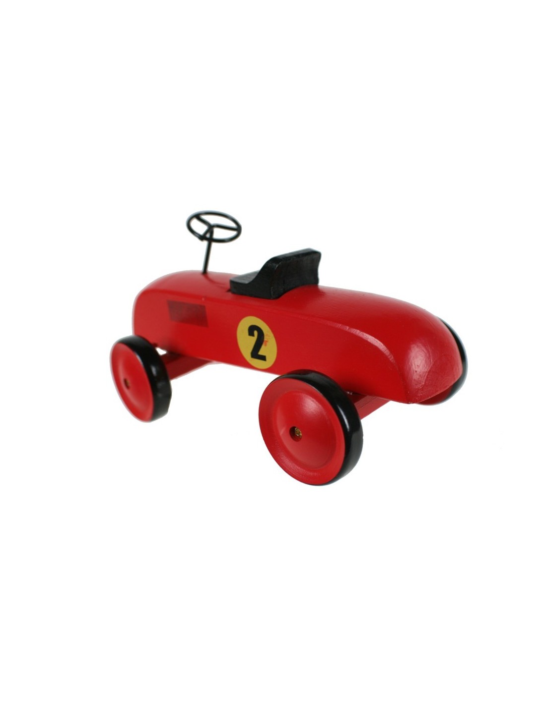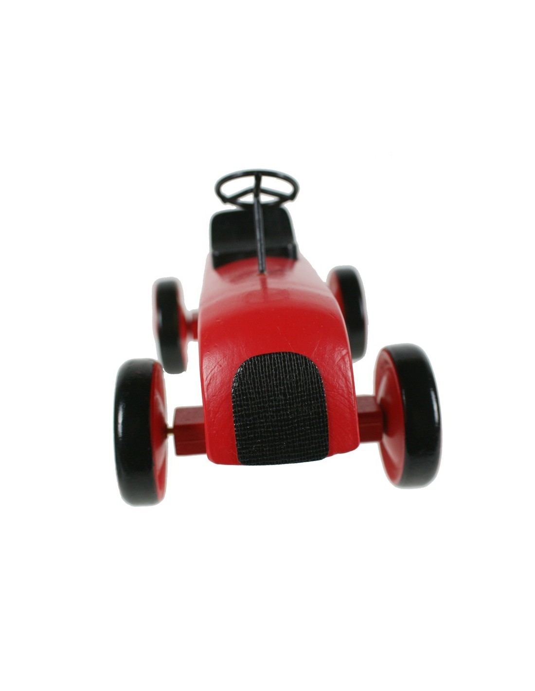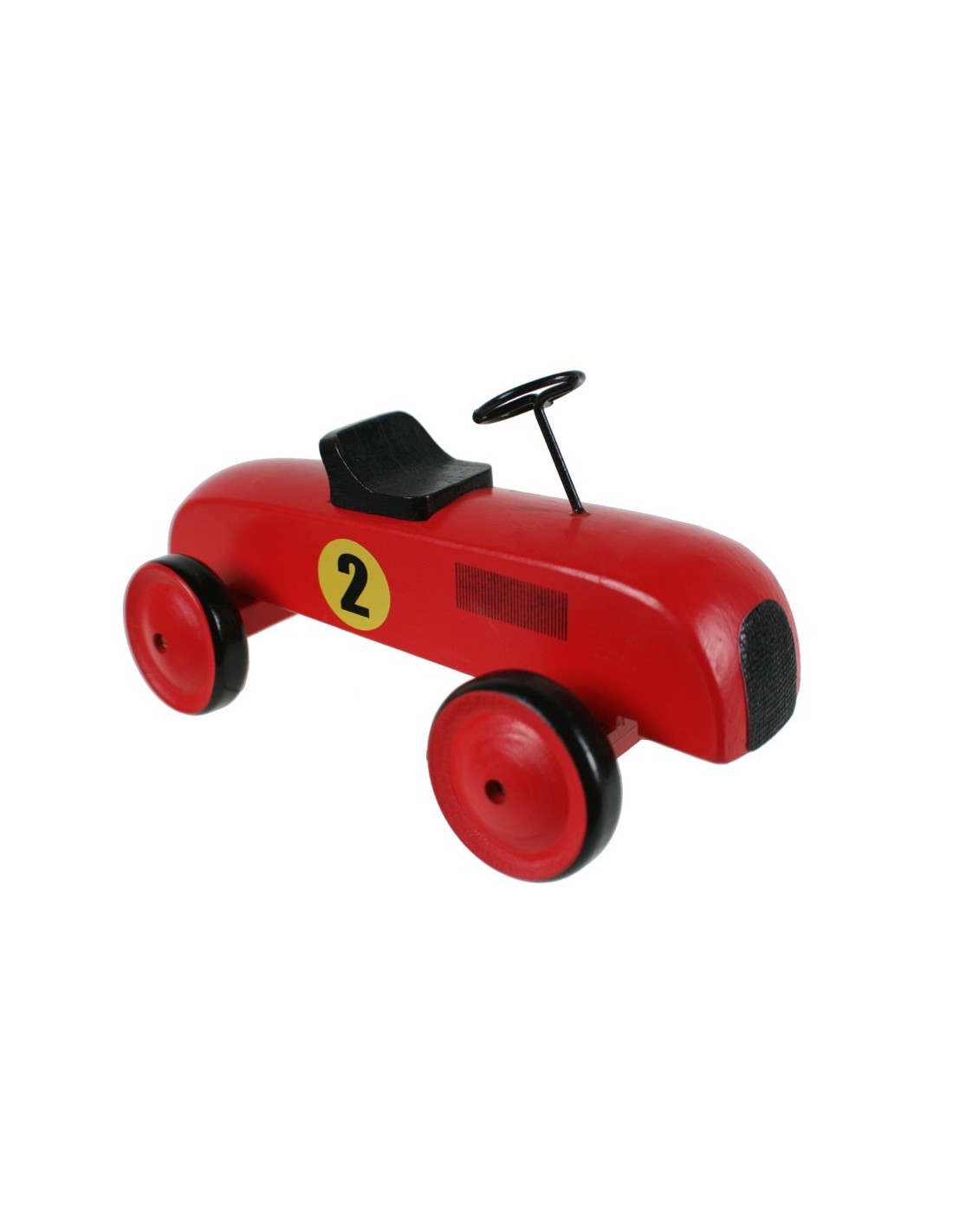 Aquest cotxe de carreres de fusta vermella és una joguina clàssica amb un disseny senzill i atemporal que captiva tant nens com adults. La seva construcció de fusta massissa li dona robustesa i un acabat durador.