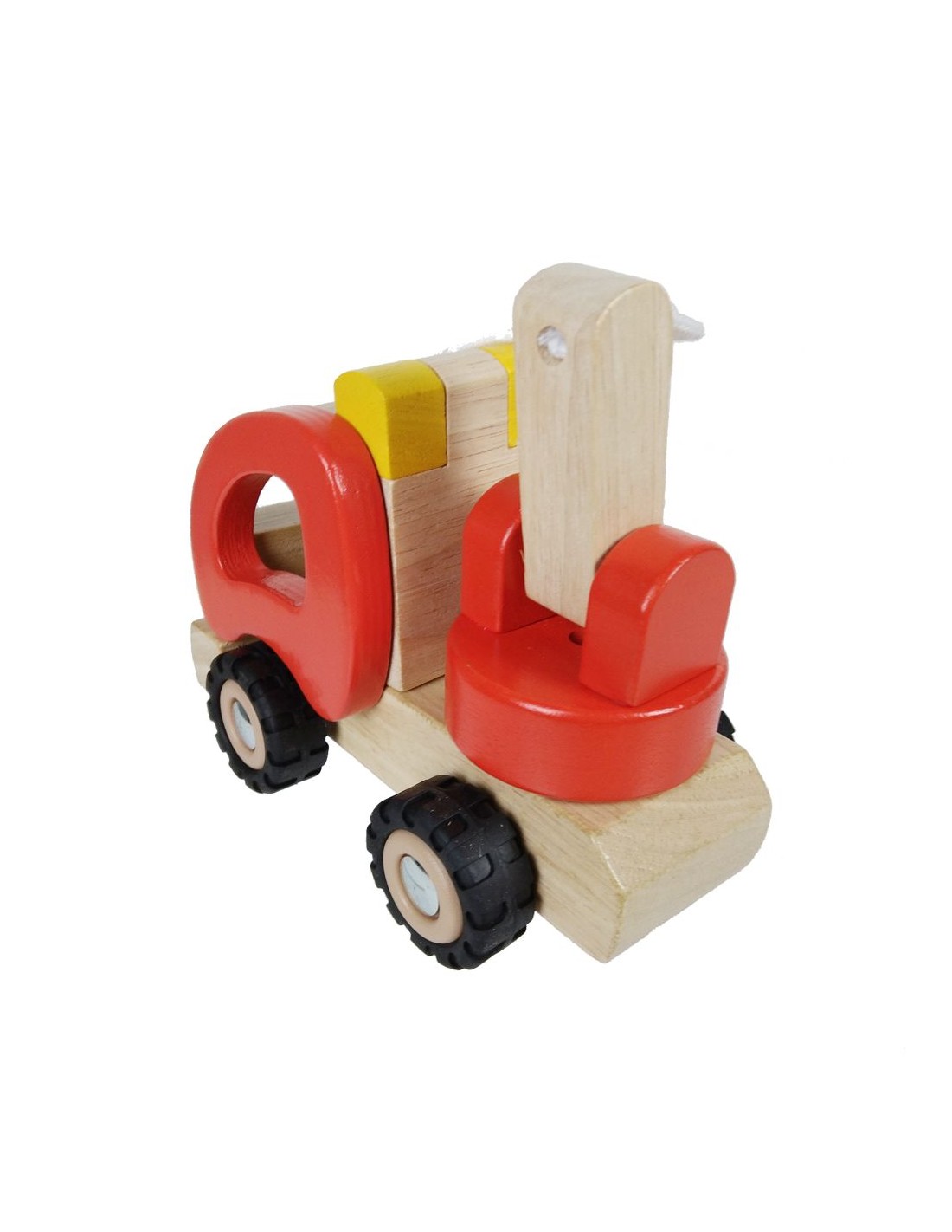 Camió Grua de Fusta Natural amb Rodes de Goma i Complements Joguina Infantil. Mides: 12x18x9 cm.