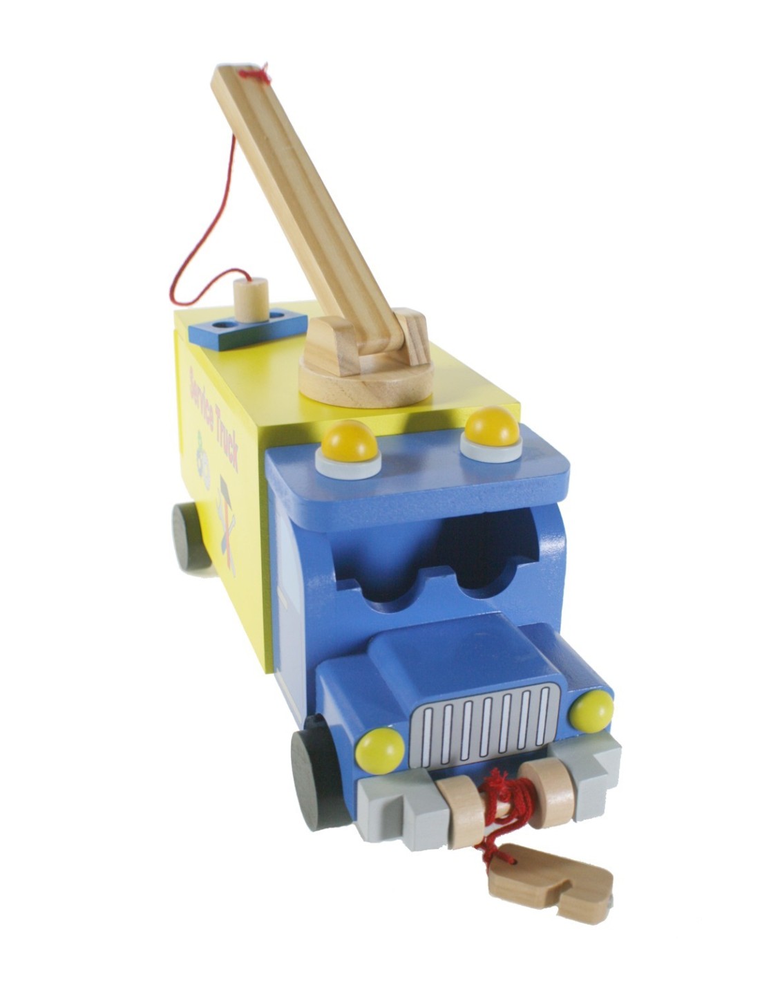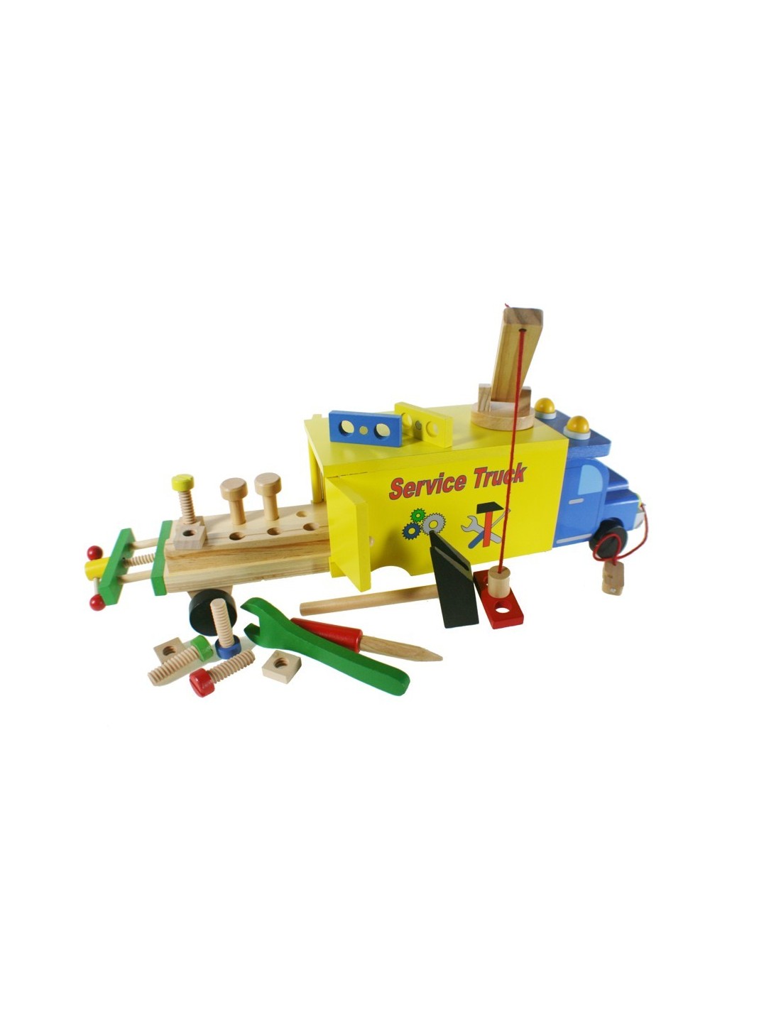 Aquest camió grua de fusta és el company perfecte per a petites i grans aventures. Amb una plataforma mòbil que s'estén fins a 15 cm, eines incloses i un sistema de grua magnètica, la diversió està garantida!